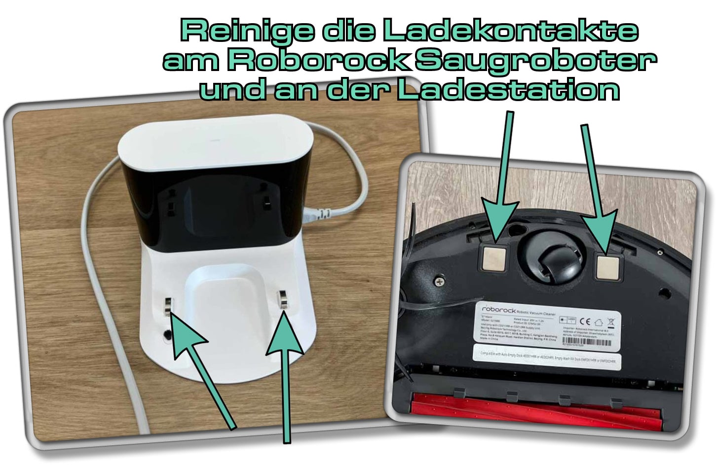 Oftmals kann der Roborock nicht mehr an seiner Ladestation andocken, weil Verschmutzung den Kontakt der Ladekontakte behindert. Befindet sich eine leichte Schmutzschicht auf diesem, könnte der Saugroboter das bemerken, weil der Strom nicht mehr ordentlich fließt. Reinige die Ladekontakte unter dem Saugroboter und auf der Ladestation mit einem feuchten Tuch. Bitte trenne vorher die Ladestation vom Strom! So könnte der Saugroboter die Station direkt wiederfinden.