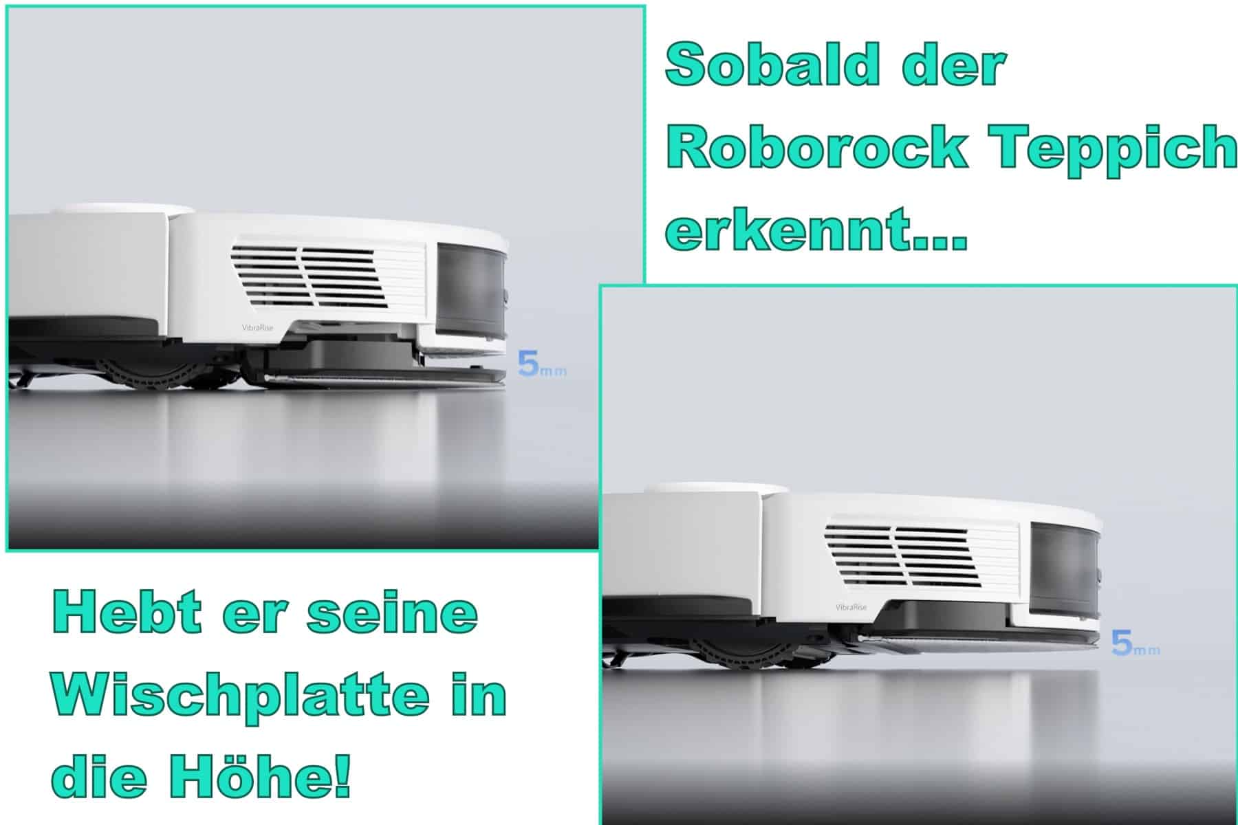 Um das Sonic Mopping auch VibraRise nennen zu können, hat der Hersteller eine weitere Funktion verbaut. Roborock hat ein spezielles Lift-System eingebaut, das den Wischmopp um 5 Millimeter in die Höhe anheben kann. Ein auf der Unterseite verbauter Ultraschallsensor erkennt die Veränderung des Bodens und teilt dem Roboter blitzschnell mit, wenn er sich auf Teppichboden befindet. Gleich darauf hebt der Roborock Saug-Wischroboter sein Wischpad nach oben, damit der Teppich nicht nass wird.