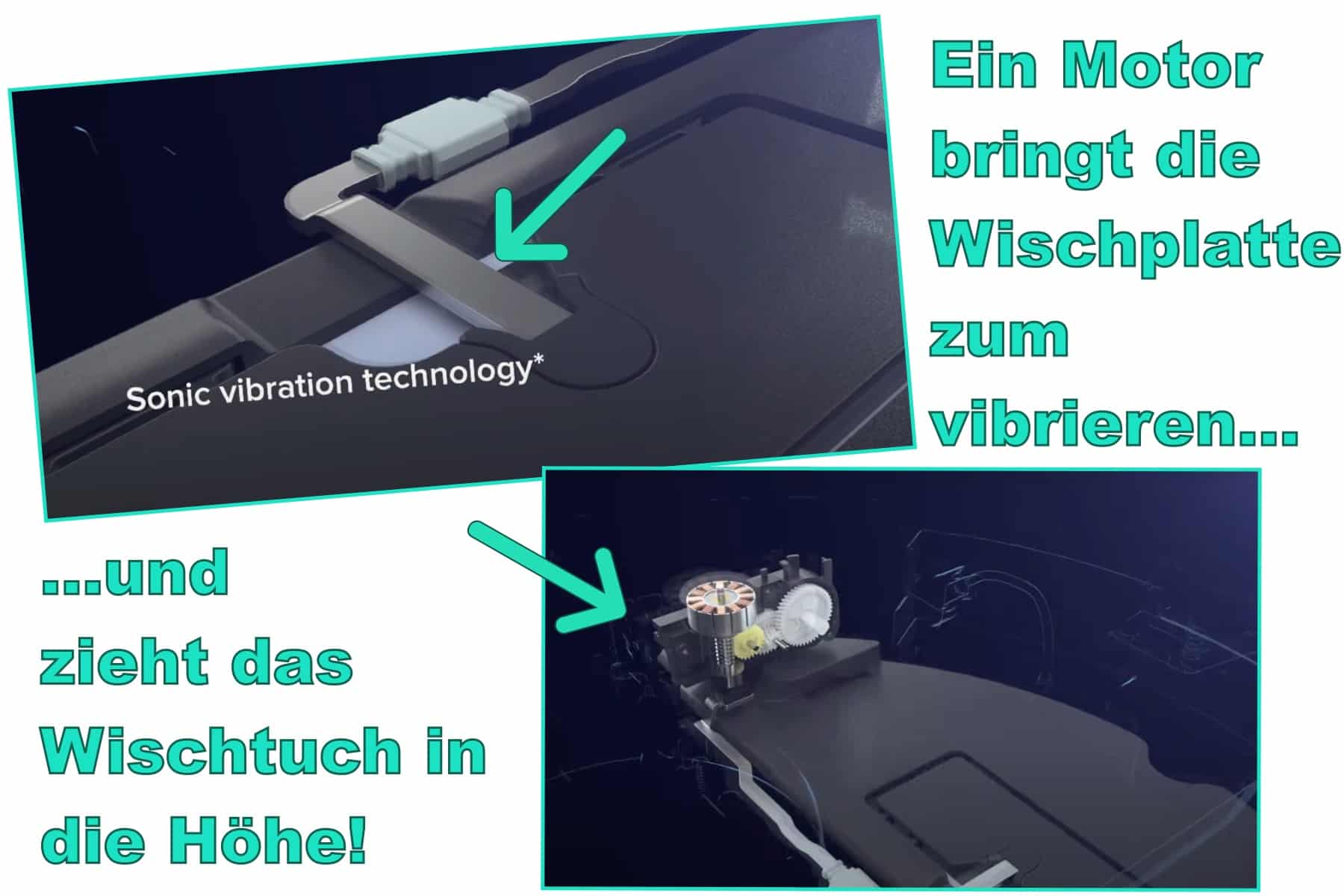 Ein im Roboter befindlicher Motor bringt nicht nur das Wischtuch zum Vibrieren, sondern hebt das Wischtuch auch samt Platte an. Wenn man die Wischplatte am Roboter entfernt, erkennt man einen kleinen metallenen Steg. Dieser wird vom Motor in Vibration versetzt und befindet sich bei eingesetzter Wischplatte mit seiner Spitze genau im mittleren Teilstück der Wischplatte. So vibriert dann das Wischtuch. Die anhebbare Funktion wird ebenfalls vom Motor übernommen und komm dann zum Einsatz, wenn Teppichboden vom Ultraschallsensor lokalisiert wird.