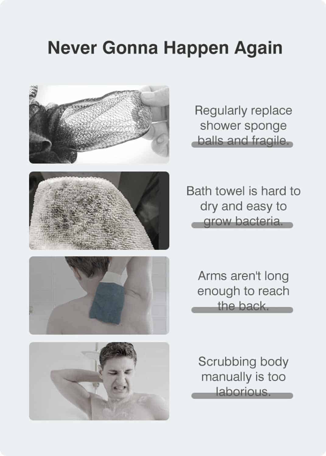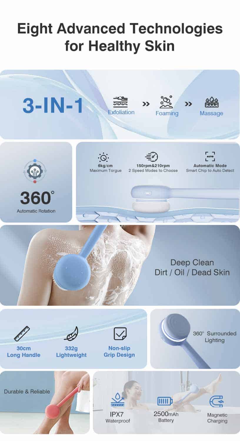 Die neue Duschbürste ist mit einem 2500 mAh Akku ausgestattet, die ein vierstündiges Duscherlebnis ermöglichen soll. Sie besteht aus einem Griff und einem Bürstenkopf, der rotiert und über verschiedene Aufsätze verfügt. Somit kann man dann alle möglichen Körperstellen nicht nur schrubben oder einschäumen, sondern auch mit verschiedenen Lotionen eincremen. Ein Massage-Aufsatz soll zudem für eine bessere Durchblutung sorgen. Mit einem Gewicht von 332 Gramm, kann man dann auch die vollen vier Stunden Duschen ohne Armschmerzen durchziehen.