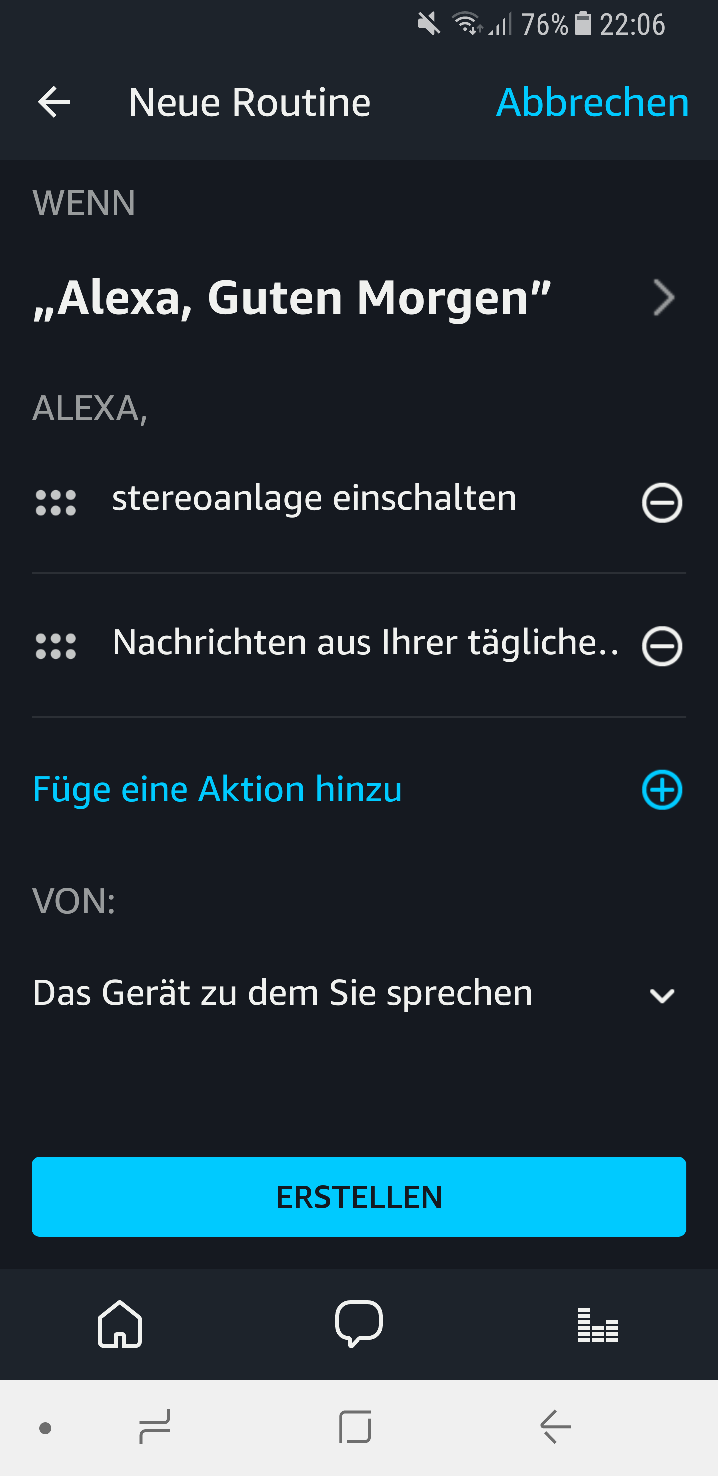 Was haben wir denn nun erstellt? Die Routine besagt nichts anderes, als bei dem Befehl „Guten Morgen“ die Stereoanlage anzuschalten und mir meine Nachrichten vor zu lesen. In dem Nachfolgenden Video seht ihr, wie die Routine ausgeführt wird.