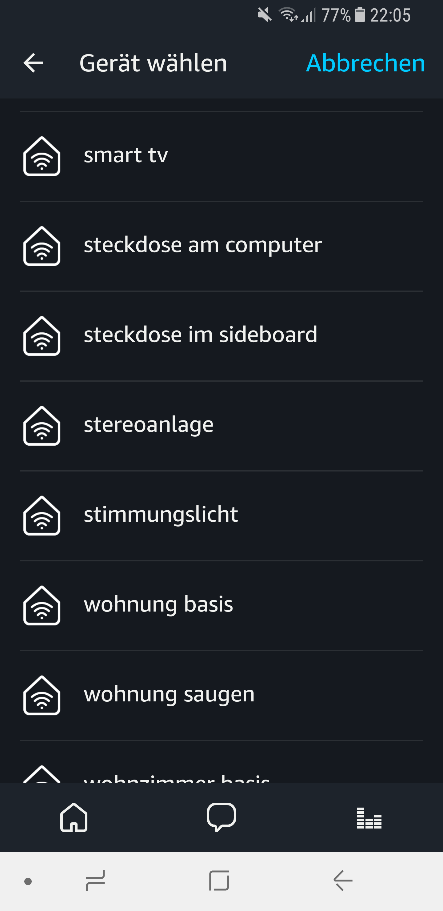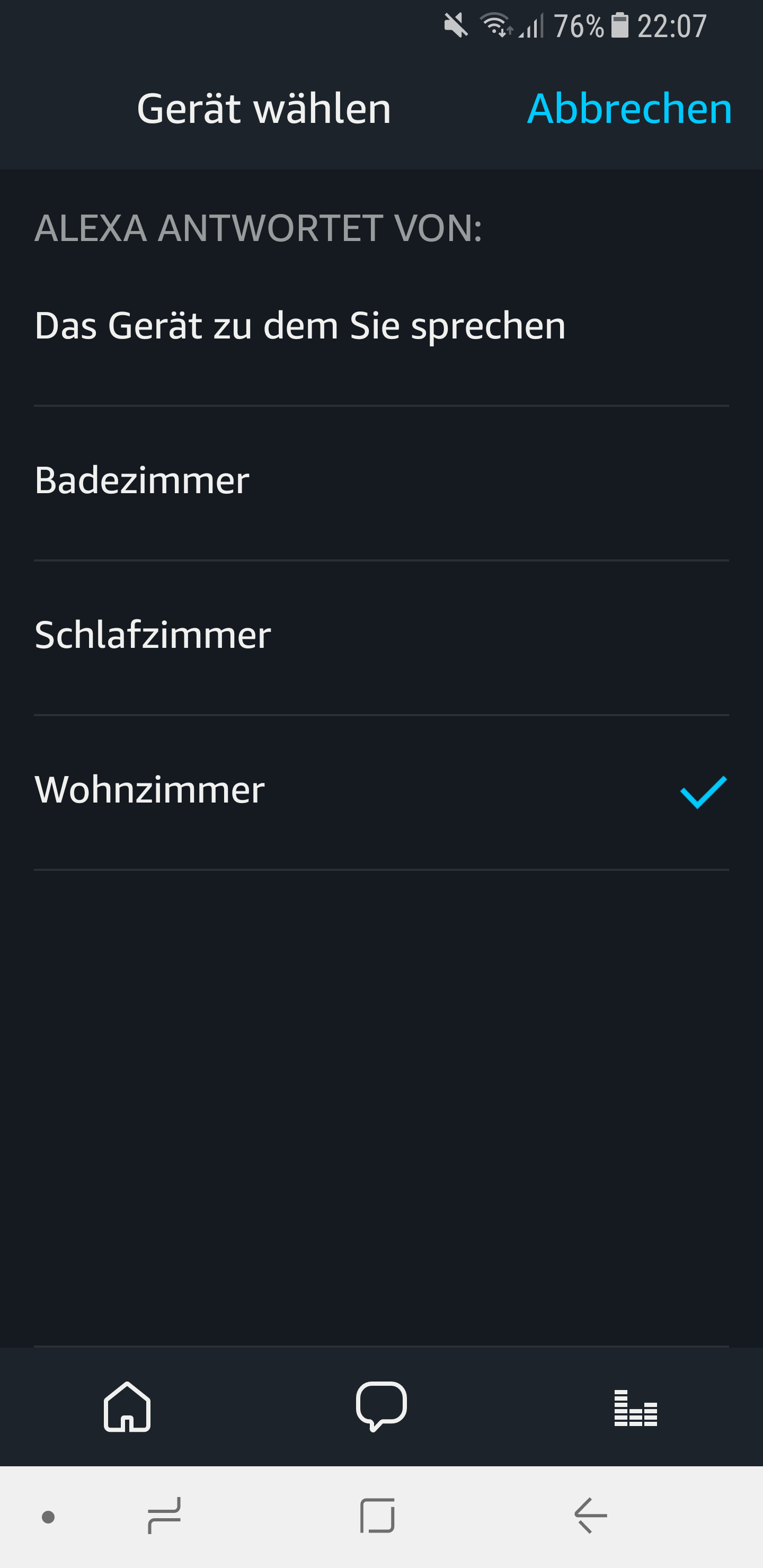 - In meinem Fall möchte ich das im „Wohnzimmer“ machen. (Das sind die Namen, die ich an meine Echos vergeben habe)