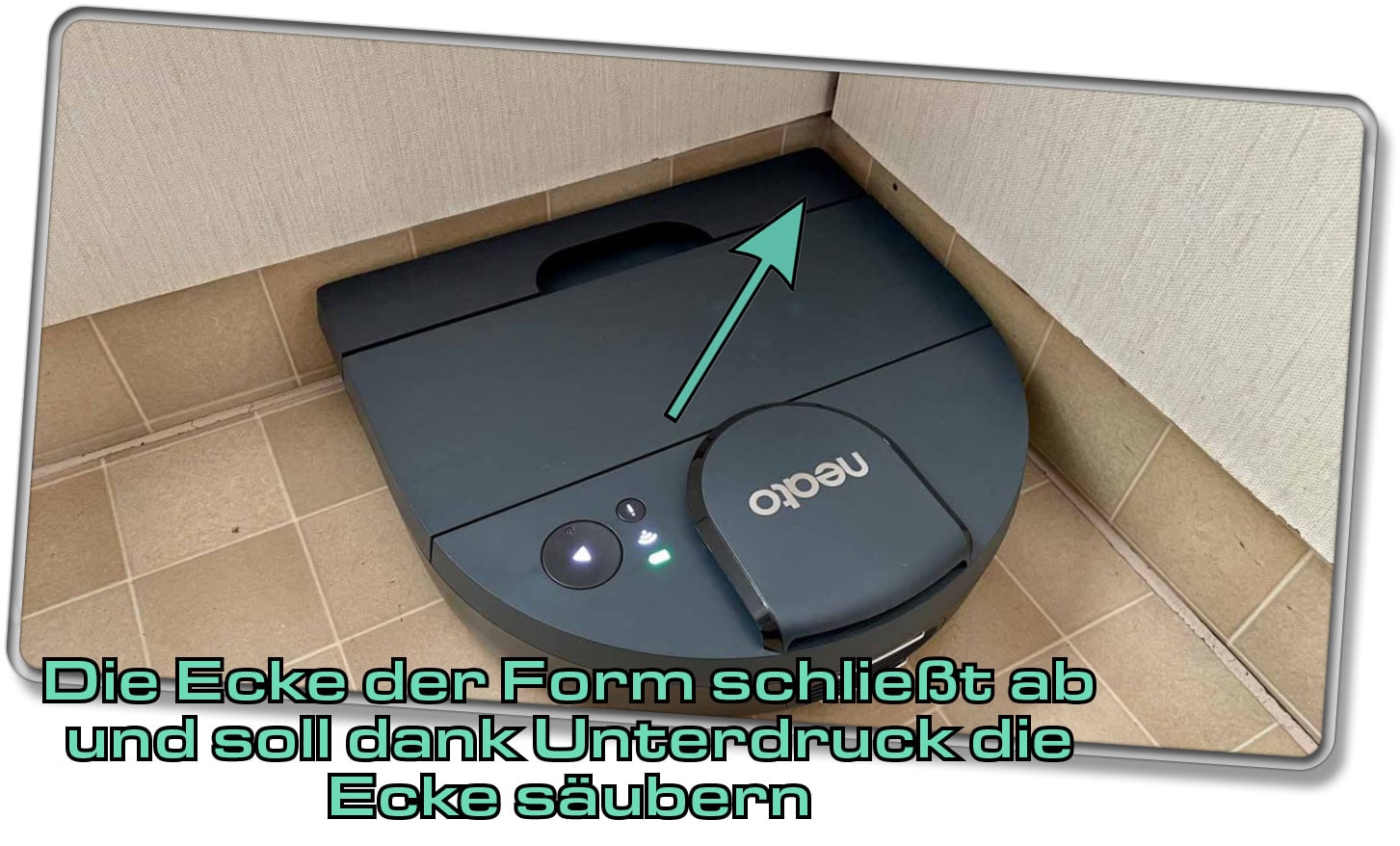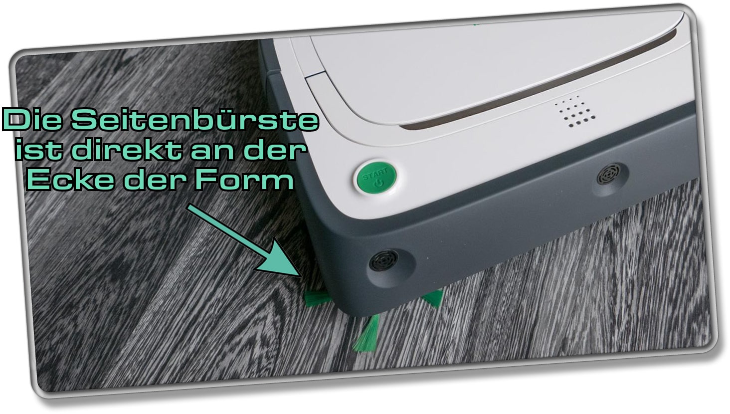 Der Saugroboterhersteller Neato hingegen verbaut die Seitenbürste etwas weiter hinten. Der Grund dazu, warum die Ecke trotzdem besser gereinigt werden soll als bei einem runden Gerät, ist laut Aussagen von Neato der dabei entstehende Unterdruck. Der Roboter soll so weit in die Ecke fahren, dass die Form des Roboters mit ihr abschließt und dadurch ein Unterdruck in Richtung Ansaugschacht entsteht.
