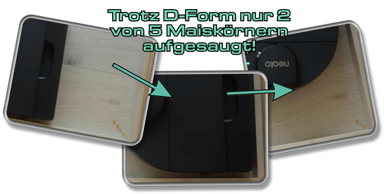 Auch oft gesehen, ist die Tatsache, dass die Navigation nicht so fein abgestimmt ist, dass die Ecken mit der D-Form gar nicht komplett ausgefüllt werden. Die Roboter halten gerne mal vor einer aufkommenden Wand an und drehen dann ein. So kommt es, dass selbst Roboter mit verbauter Bürste an einer Ecke der D-Form nicht bis in die Ecken vordringen. Bestes Beispiel ist der Dreame W10 und W10 Pro. Diese liefern hervorragende Ergebnisse, jedoch auch keine besseren als ein runder Saugroboter.
