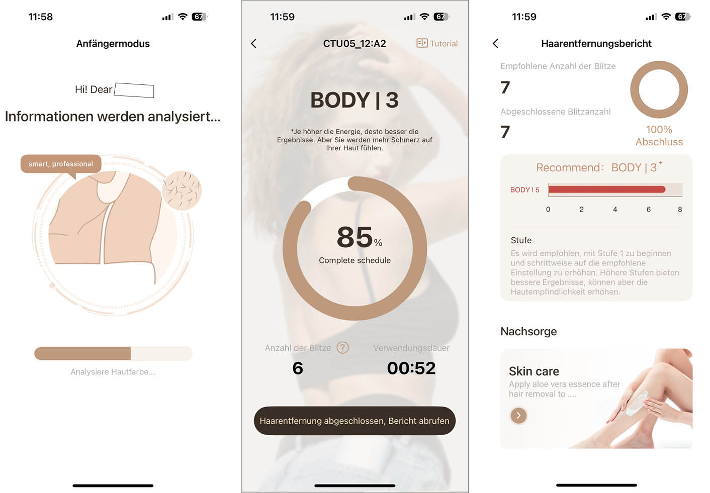 Die CTONE-App ist mehr als nur eine praktische Ergänzung, sie ist ein zentrales Element des Geräts. Sie lässt einen seinen Hauttyp, Haardichte und Körperbereich analysieren und gibt konkrete Empfehlungen zur Energieeinstellung und erinnert an Folgebehandlungen.