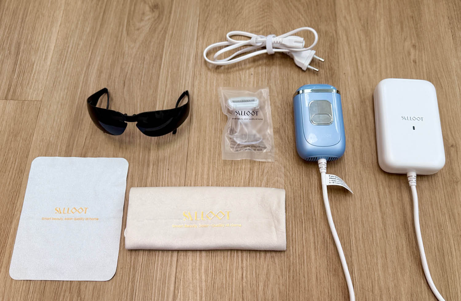 Im Lieferumfang des Salloot Nova P5 ist alles enthalten, was für einen schnellen Start benötigt wird. Neben dem kompakten IPL-Gerät selbst liegen ein passendes Ladekabel, eine Schutzbrille für die sichere Anwendung, ein Rasierer, ein Aufbewahrungsbeutel, ein Reinigungstuch sowie eine leicht verständliche Bedienungsanleitung bei. Zusätzlich wird auf die Nutzung der begleitenden CTONE-App hingewiesen, die nach dem Download weitere Funktionen freischaltet und Schritt für Schritt durch die Anwendung führt. Alle Komponenten sind sorgfältig verpackt und der erste Eindruck wirkt hochwertig und gut durchdacht.