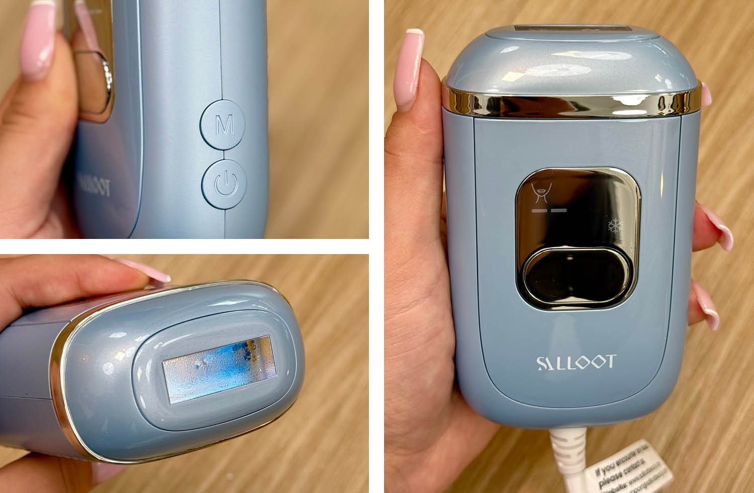 Der Salloot Nova P5 präsentiert sich in einem modernen blauen Gehäuse, das sich optisch von vielen klassischen Weißtönen im Beauty-Bereich abhebt. Das Design wirkt frisch, jung und gleichzeitig hochwertig. Mit seinem kompakten Format und nur 102 g Gewicht liegt das Gerät besonders leicht in der Hand und eignet sich auch für längere Anwendungen ohne Ermüdung. Die Verarbeitung ist gut. Die Materialien wirken robust, die Oberfläche fühlt sich angenehm glatt an, und die Bedienelemente sind übersichtlich angeordnet. Besonders die Kühlfläche aus Saphirglas macht einen stabilen, langlebigen Eindruck. Insgesamt hinterlässt der Nova P5 in Punkt Design und Qualität einen sehr durchdachten und stimmigen Gesamteindruck.
