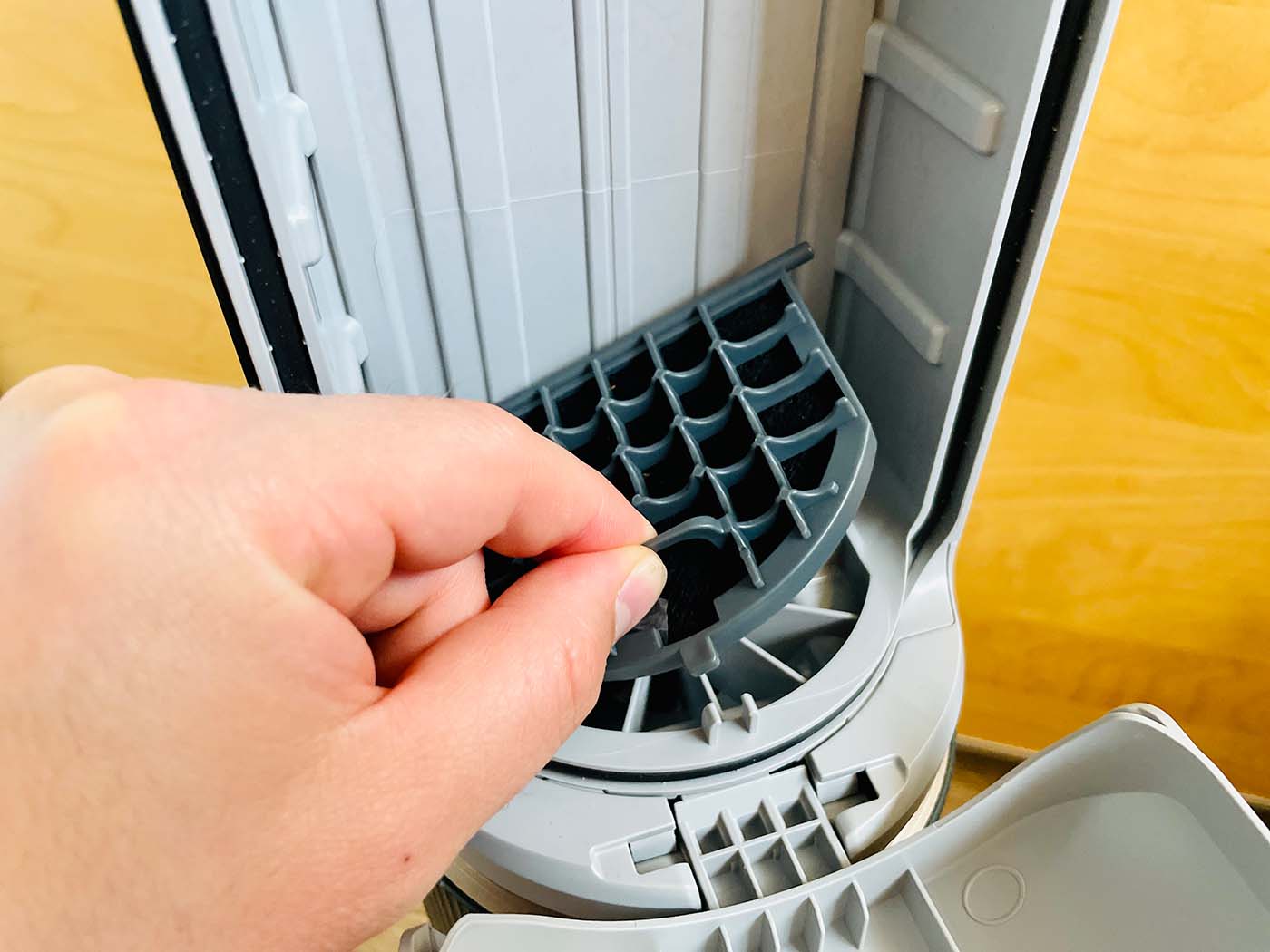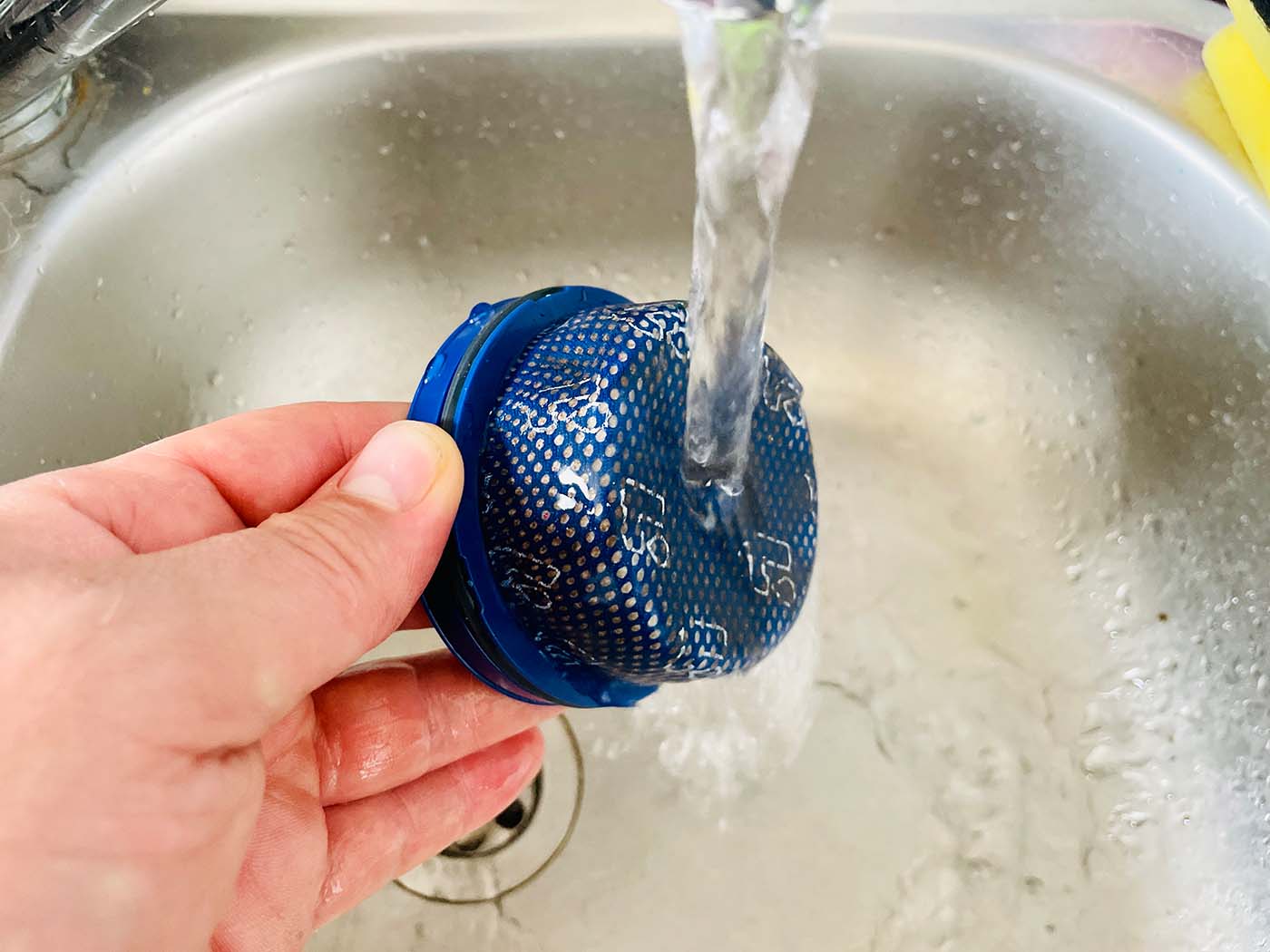 Die Filter kann man einfach unter fließendem Wasser ausspülen. Ich habe den Metallgitter-Filter vorher zusätzlich senkrecht auf den Boden geklopft, wodurch viel feiner Staub nach unten herausfiel.
