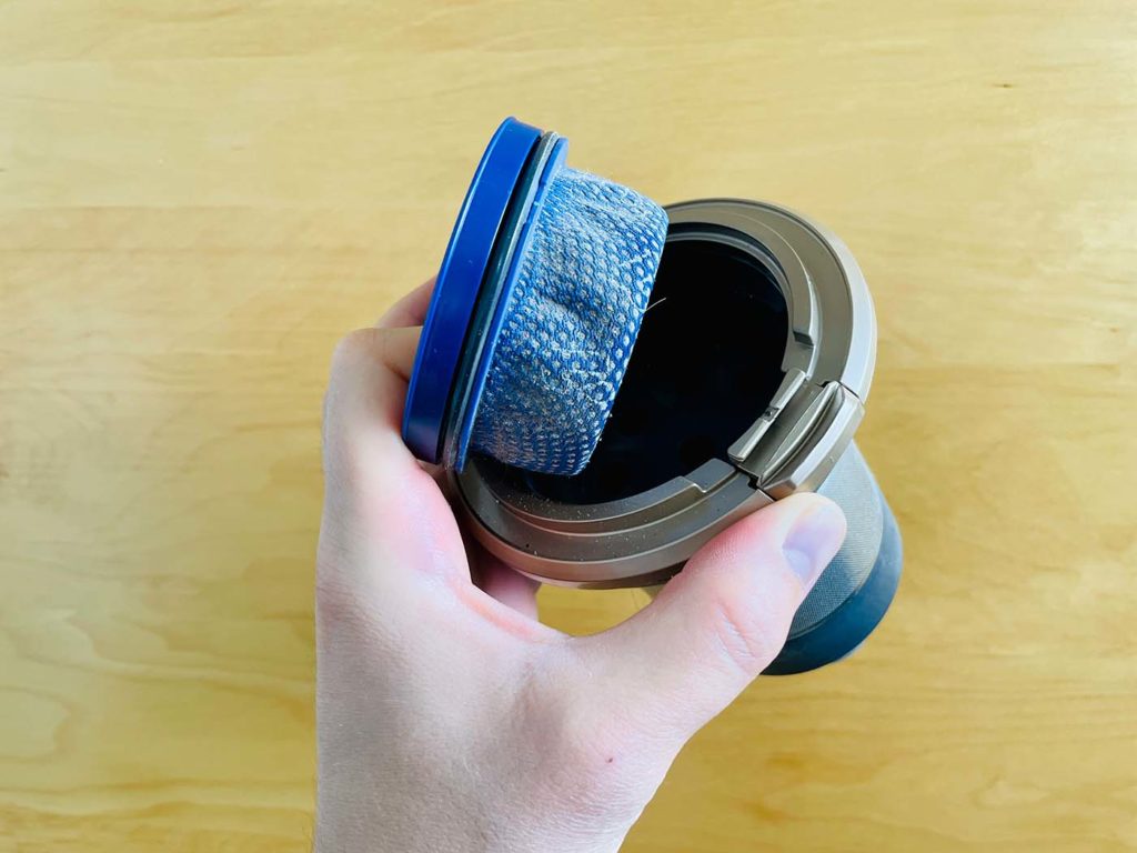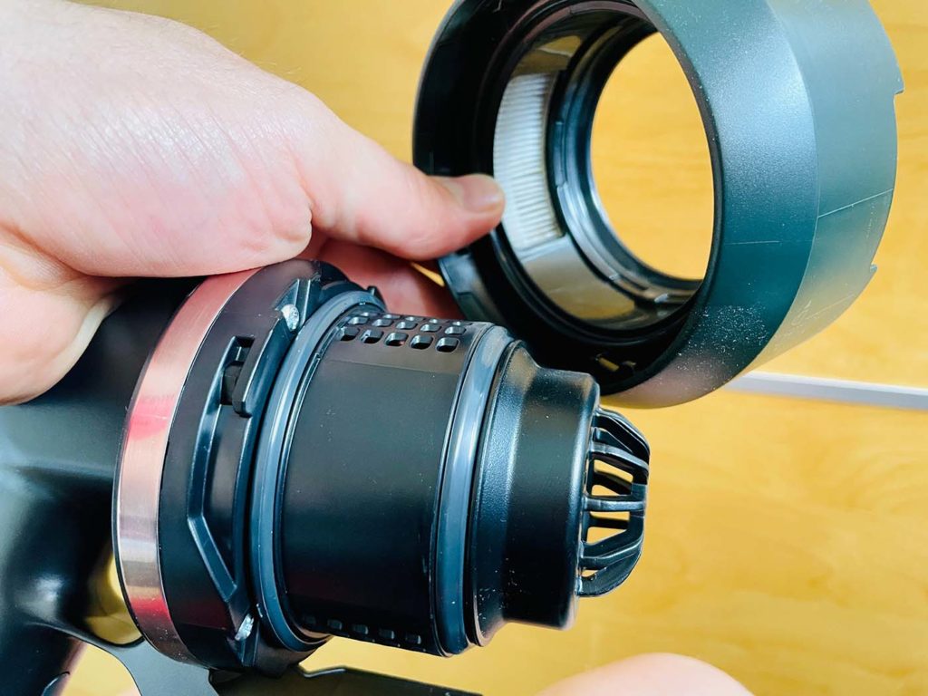 Ein weiterer Feinpartikelfilter sitzt in einem Ring am Handteil des Samsung Bespoke Jet. Diesen kann man einfach durch Drehen gegen den Uhrzeigersinn entnehmen und ebenfalls unter fließendem Wasser reinigen.