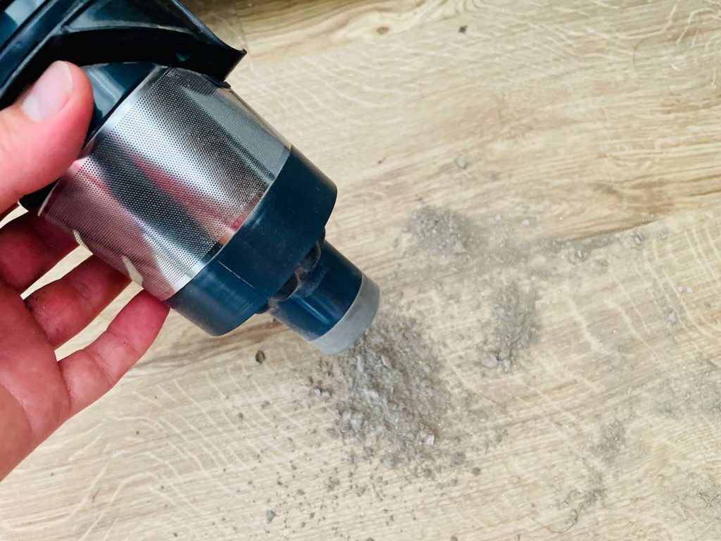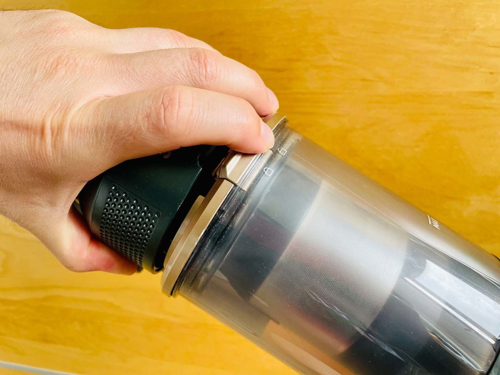 Als Erstes wird der Staubbehälter vom Handteil getrennt. Dafür drückt man einfach die dafür vorgesehene Taste am Staubbehälter.