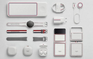 Samsung hat sich wieder Unterstützung genommen und zusammen mit Thom Browne eine Special Edition seiner neuen Geräte entwickelt. So gibt es das Galaxy Z Fold 3 5G, das Galaxy Flip3 5G und die Galaxy Watch4 mit weißem Grund auf den für Thom Browne typischen Linien in rot und blau. Zusätzlich dazu ist ein Thom Browne Schriftzug auf dem Produkt zu sehen. Bei der Galaxy Watch4 wurde dieser ins Gehäuse eingraviert.