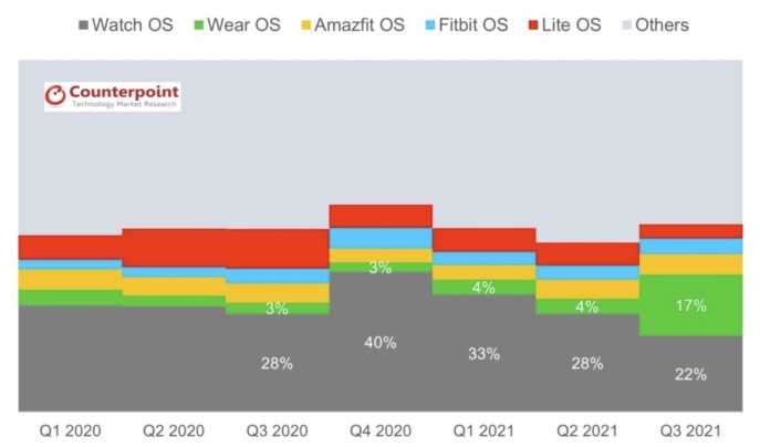Die neuen Zahlen von Counterpoint zeigen, dass Wear OS nicht länger das zurückgelassene Betriebssystem ist. Seit der Zusammenarbeit zwischen Google und Samsung, bei der mit Wear OS by Samsung das Beste aus beiden Systemen vereint wurde, mit der Samsung Galaxy Watch4-Reihe auf den Markt kam, hat Wear OS einen deutlichen Umsatzschub bekommen.