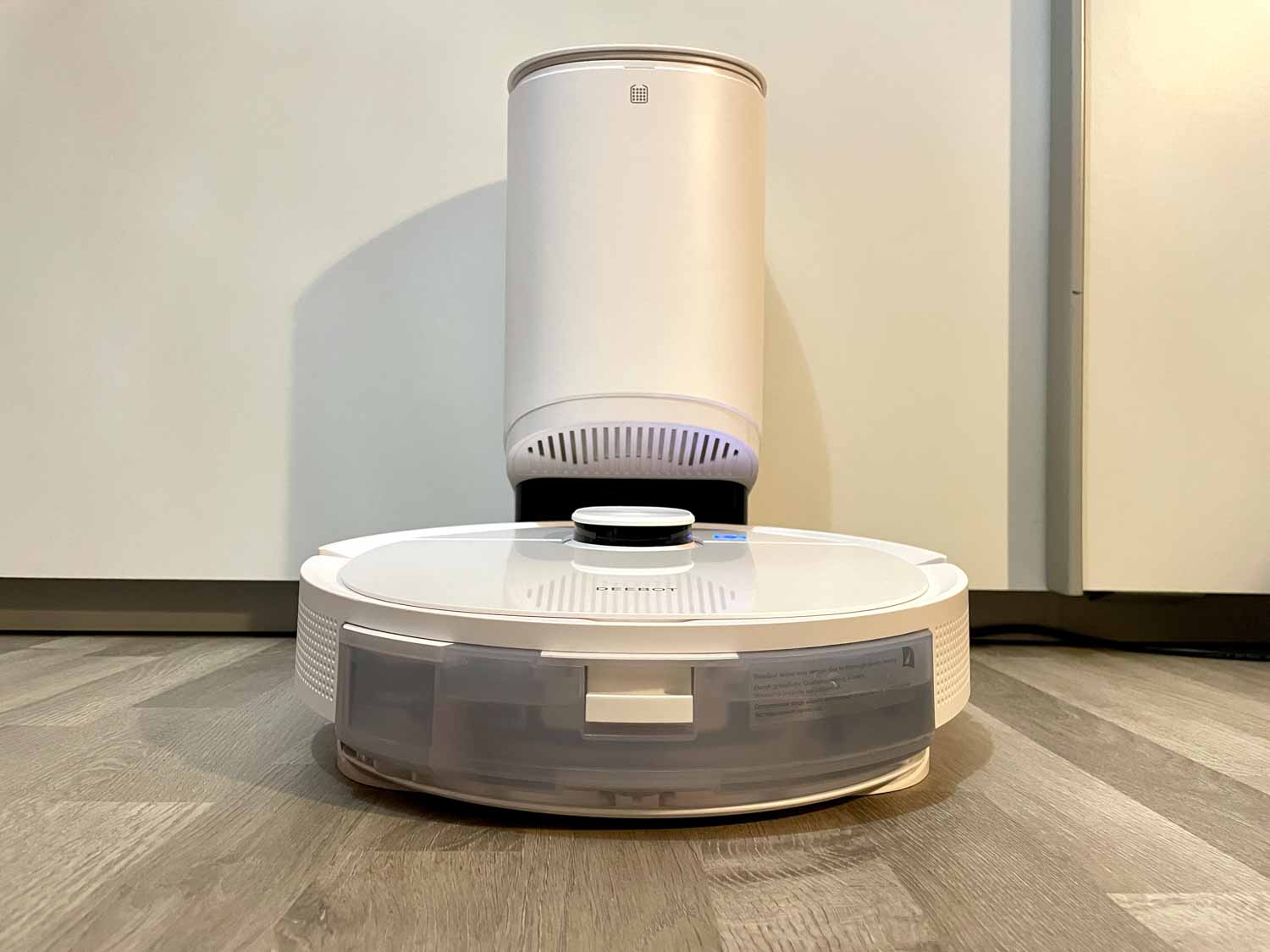 - Der Deebot T9+ auf seiner Absaugstation
