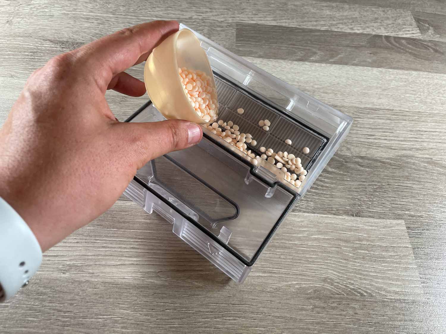 - Die Wäscheperlen werden in den Staubbehälter gegeben.