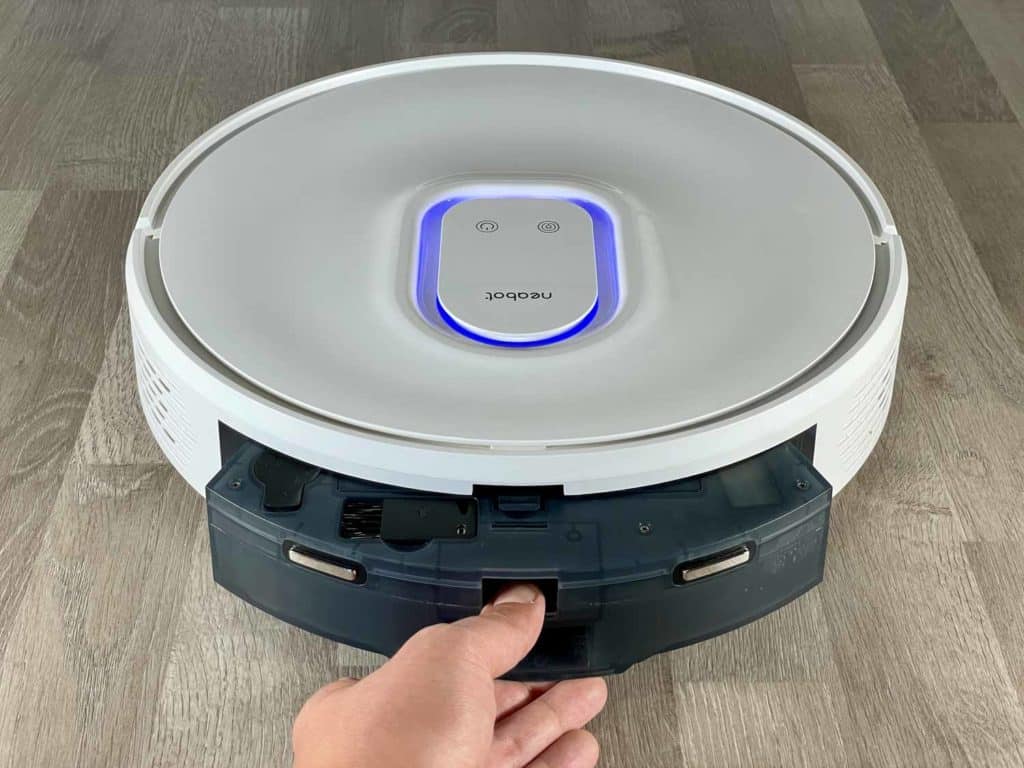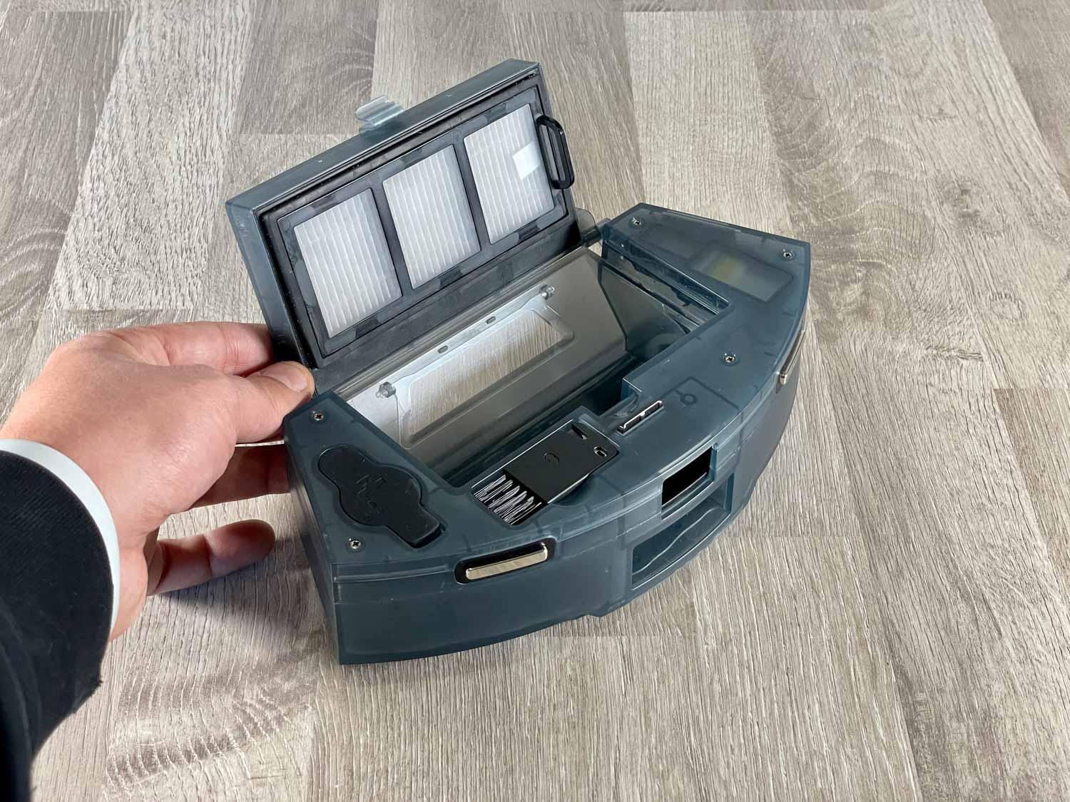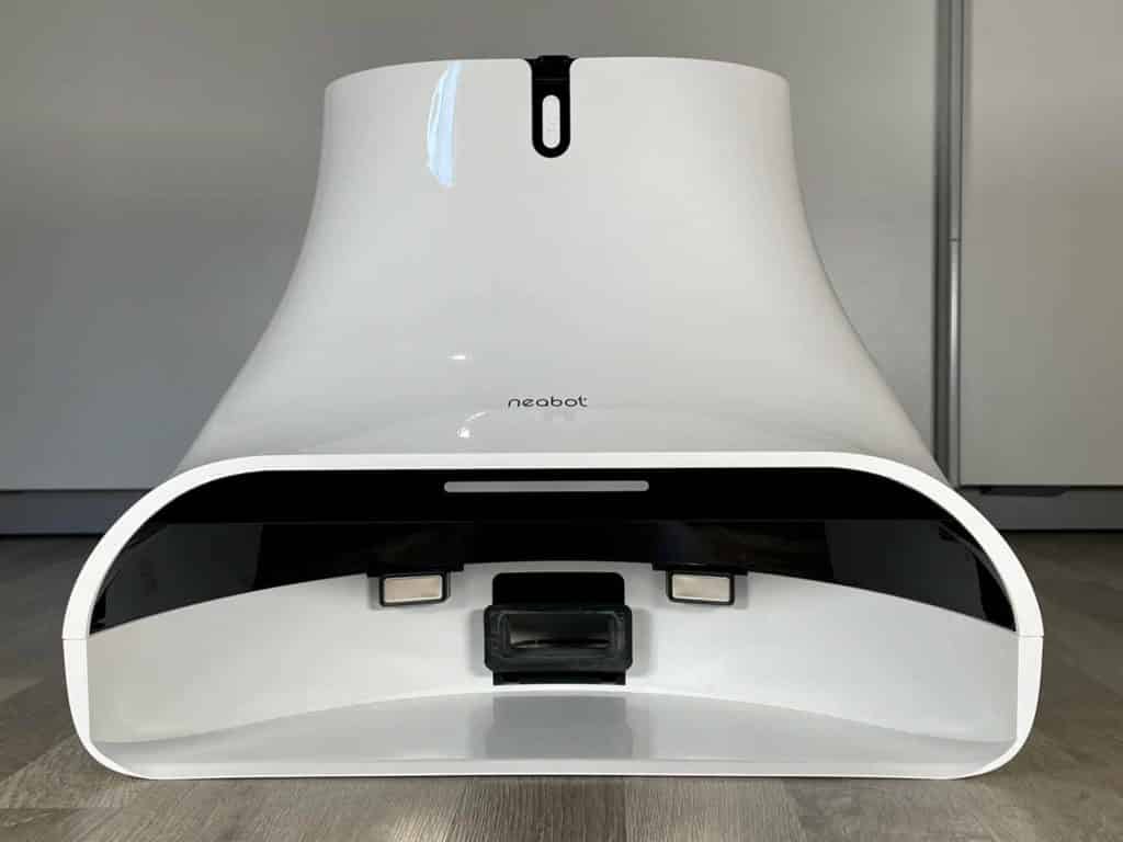 Der Staub- und Wasserbehälter befindet sich im Heck des Neabot NoMo Q11. Hierbei handelt es sich um einen Kombibehälter, der beide Behältnisse vereint. Über einen schwarzen Gummiverschluss lässt sich das Wasser einfüllen und über eine Klappe auf der Oberseite, kommt man an den Staubbehälter und Feinstaubfilter. Beim Filter selbst handelt es sich um ein Mehrfach-Filter-System. Gerade für Allergiker ist das eine wichtige Sache. Der Staubbehälter besitzt zudem ein kleines integriertes Reinigungstool und ein Absaugloch auf seiner Rückseite, durch das der Schmutz durch die Absaugstation abgesaugt wird.