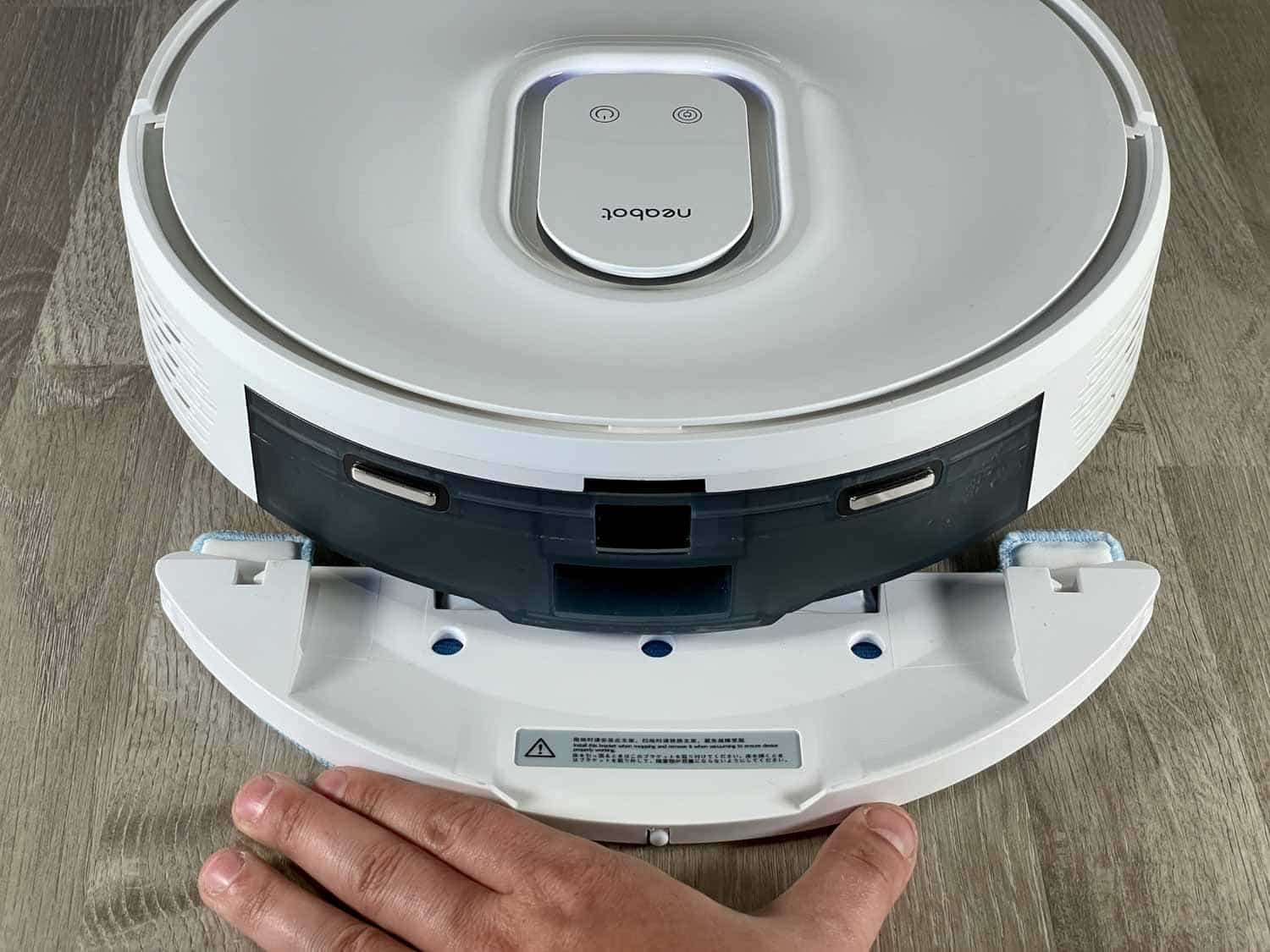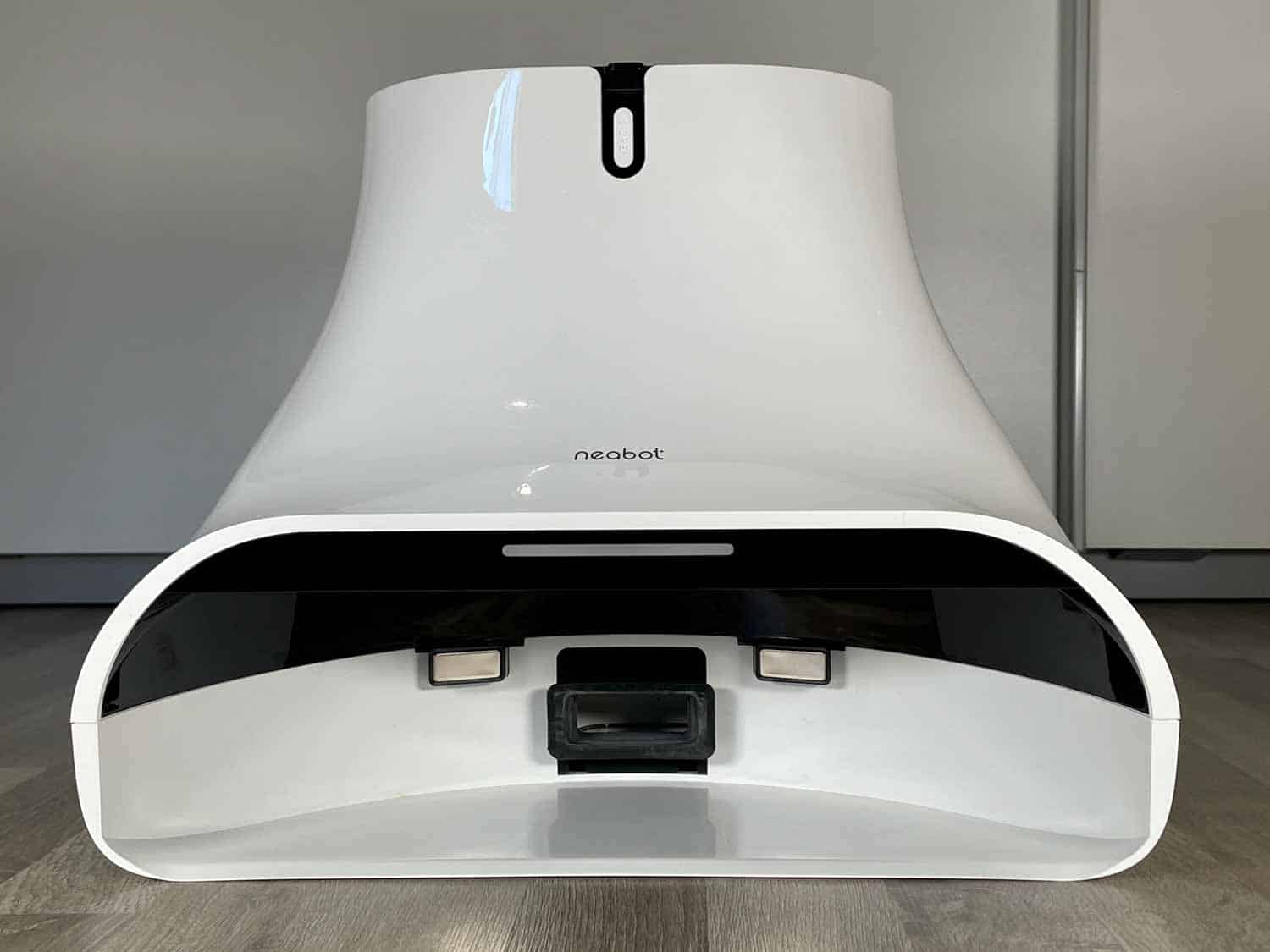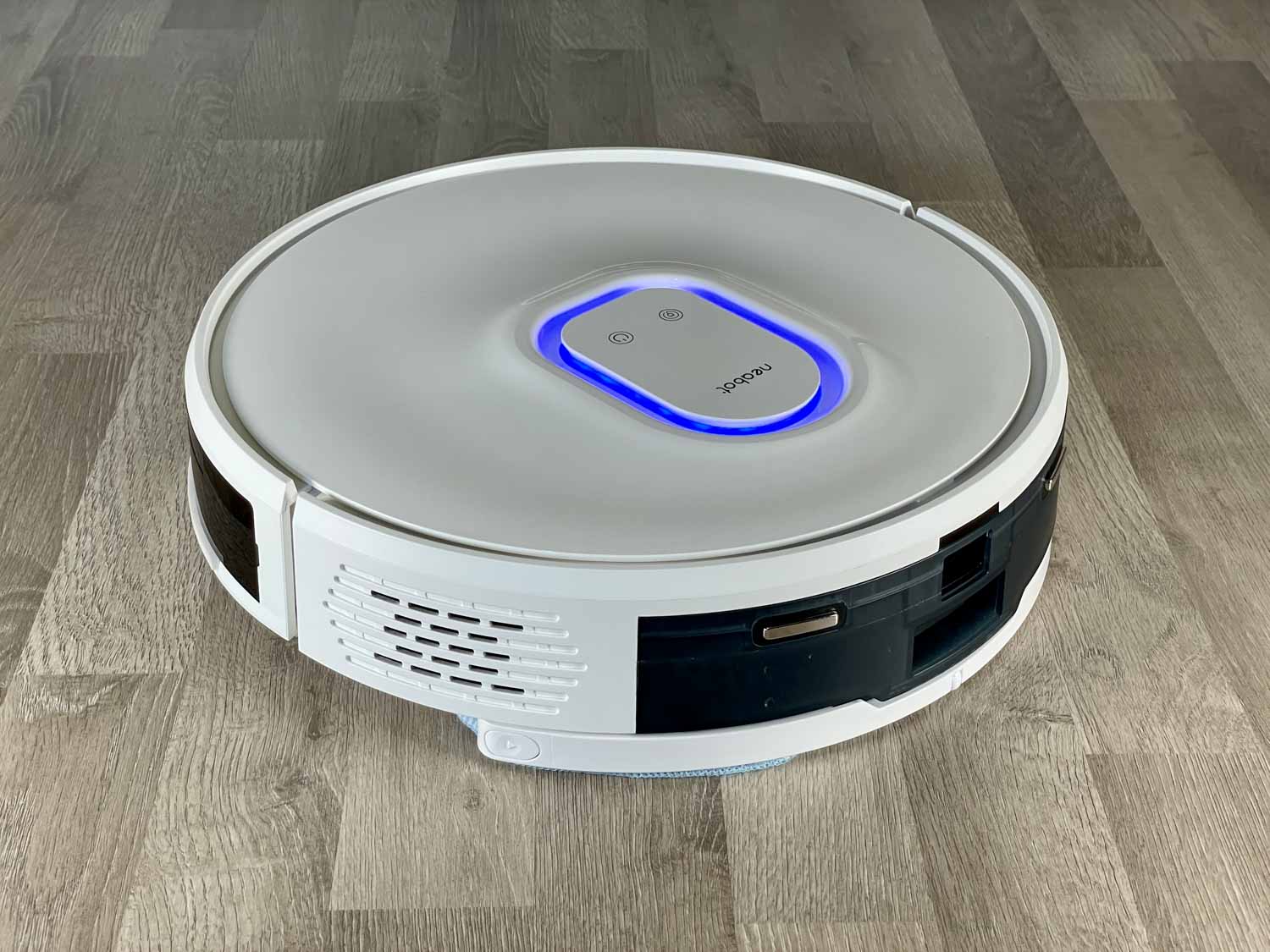 Der in Weiß gehaltene und gut verarbeitete Saug-Wischroboter kommt in einem sehr flachen Design zu dir nach Hause. Einen Laserturm suchst du hier vergeblich, denn dieser wird bei diesem lasernavigierenden Roboter nicht benötigt. Die LiDAR-Sensorik ist nämlich tatsächlich im Roboter verbaut und wird über den Bumper ausgeworfen. Dadurch kann der Roboter sehr flach gebaut werden. Auf der Oberseite des Roboters gibt es wieder zwei Knöpfe, mit denen man den Roboter starten, stoppen oder zur Ladestation zurückschicken kann. Ebenso verfügt der Neabot NoMo Q11 über ein LED-Licht auf der Oberseite, das genau dort aufleuchtet, wo ein Hindernis erkannt wird.