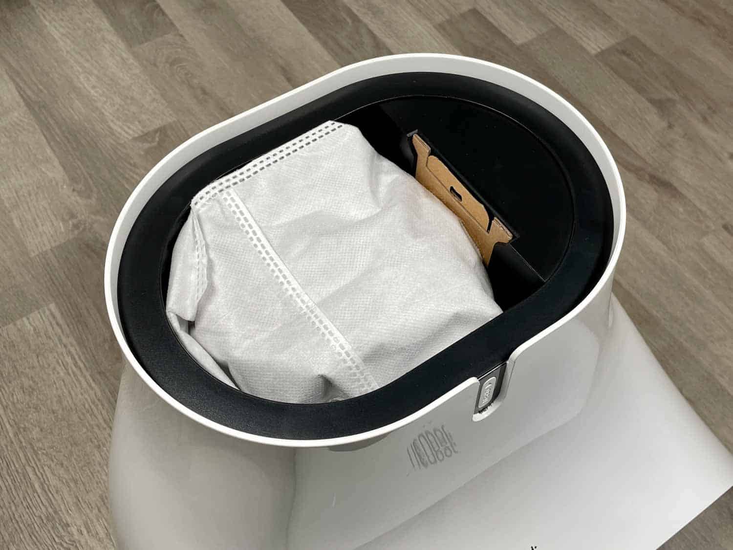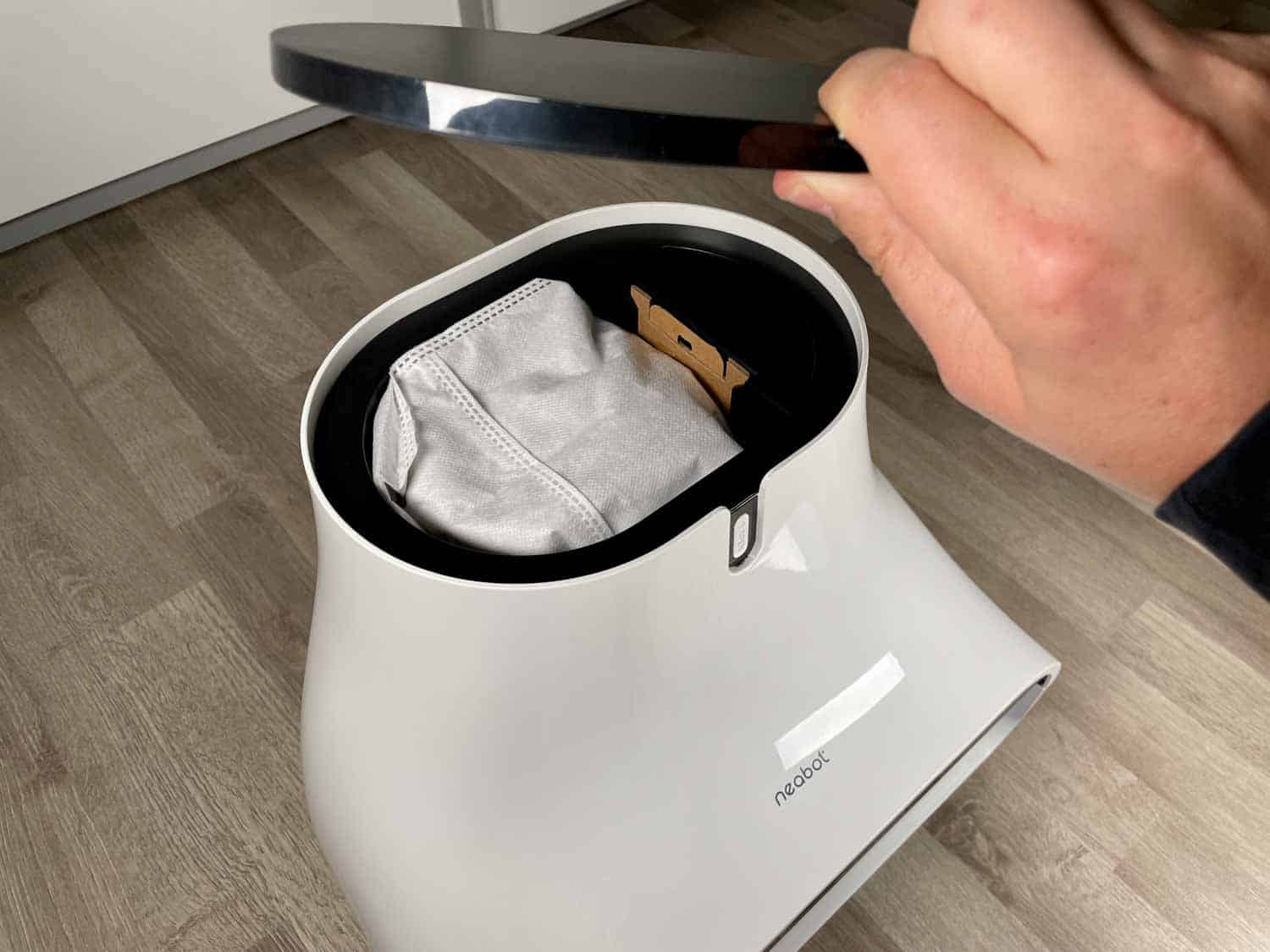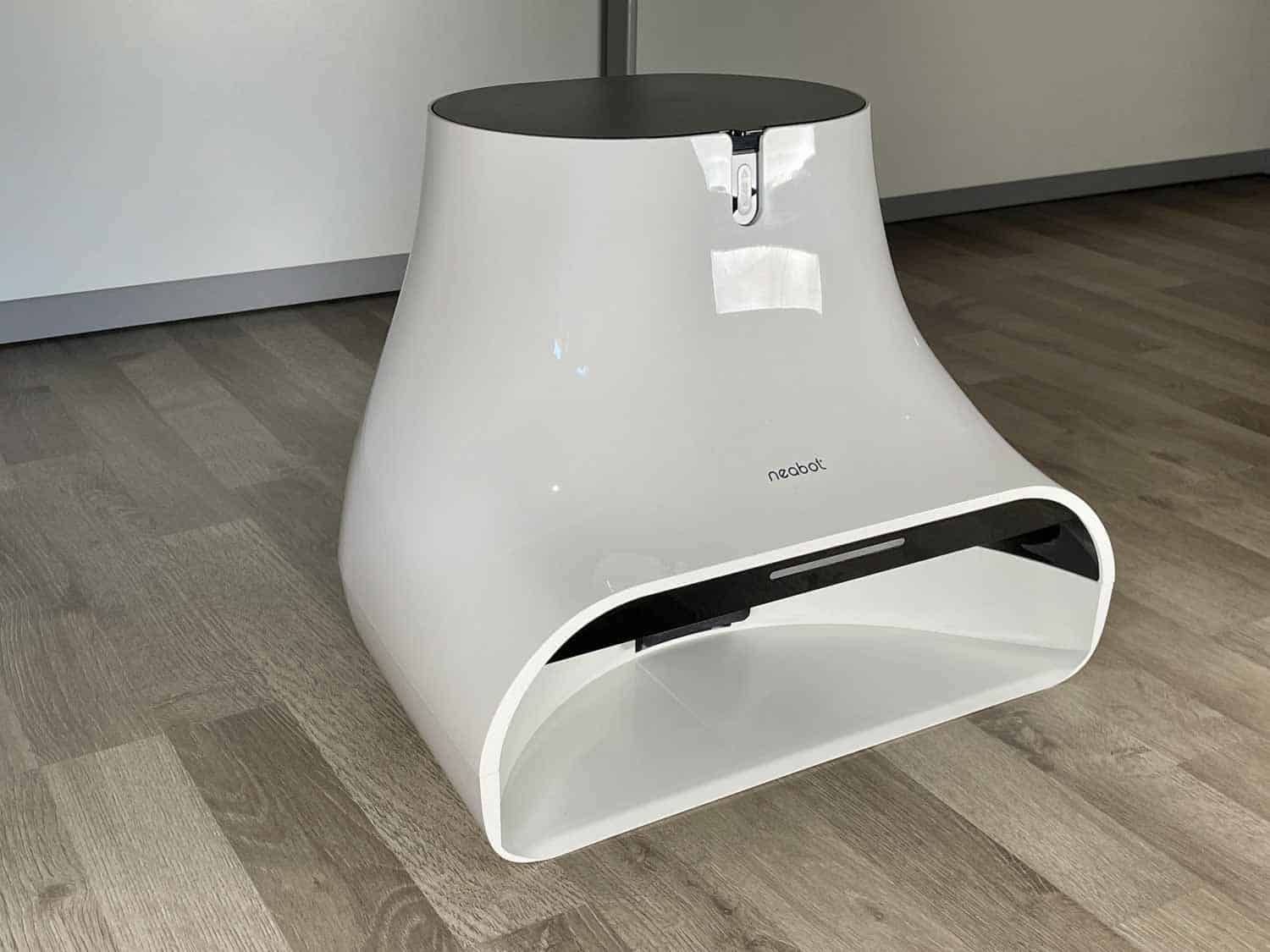 Die Absaugstation des Neabot NoMo Q11 hat ein außergewöhnliches Design, dass so kaum mal in der Welt der Saugroboter auffindbar ist. In meinen Augen erinnert sie ein wenig an einen abgelegten Reissack oder Elefantenfuß. Die Absaugstation dient gleichzeitig als Ladestation und verfügt über ein weißes Licht, das aktiviert wird, wenn der Roboter in die Station einfährt. Mit dem Heck voraus fährt der Roboter nach jeder vollendeten Reinigung in die Station und dockt langsam und behutsam an. Danach fängt die Absaugstation den Staubbehälter des Roboters leer zu saugen. Das erfolgt dank eines großen Unterdrucks, den die Station auslöst.