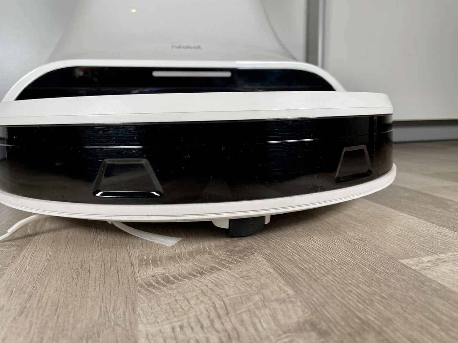 Auf der Front ist der obligatorische Bumper verbaut worden, der über eine große Kunststoffscheibe verfügt, hinter der sich die ganzen Sensoren befinden. Dort sitzen nicht nur Infrarotsensoren für die normale Abstandserkennung, sondern auch eine Obstacle Avoidance, die kleine Hindernisse erkennen kann. Selbstverständlich sind dort auch Wandsensoren eingebaut. Auf der Unterseite des Roboters gibt es nicht allzu viel zu finden. Du wirst schnell erkennen, dass eine Kombibürste aus Gummilamellen und Borsten eingesetzt ist und der Roboter über vier Absturzsensoren verfügt. Es ist auch nur eine einzige Seitenbürste verbaut.
