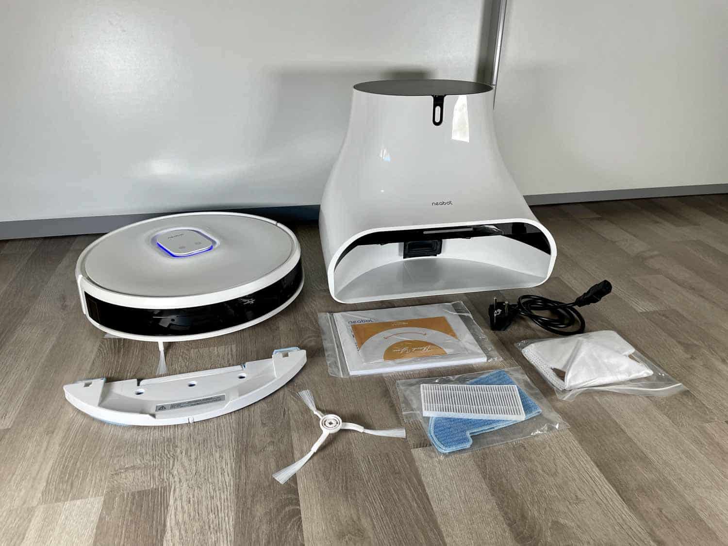 Wie es bei den meisten Saug-Wischrobotern heutzutage ist, fällt der Lieferumfang recht gering aus. Neabot legt zumindest ein weiteres Wischtuch, einen zusätzlichen Saugbeutel und einen zusätzlichen Filter mit bei. Das Netzkabel der Absaugstation ist sehr kurz, was eventuell zu Problemchen führen kann. Jedoch ist das ein Standard-Netzkabel, das man im Handel auch länger bekommt, falls man das benötigt.