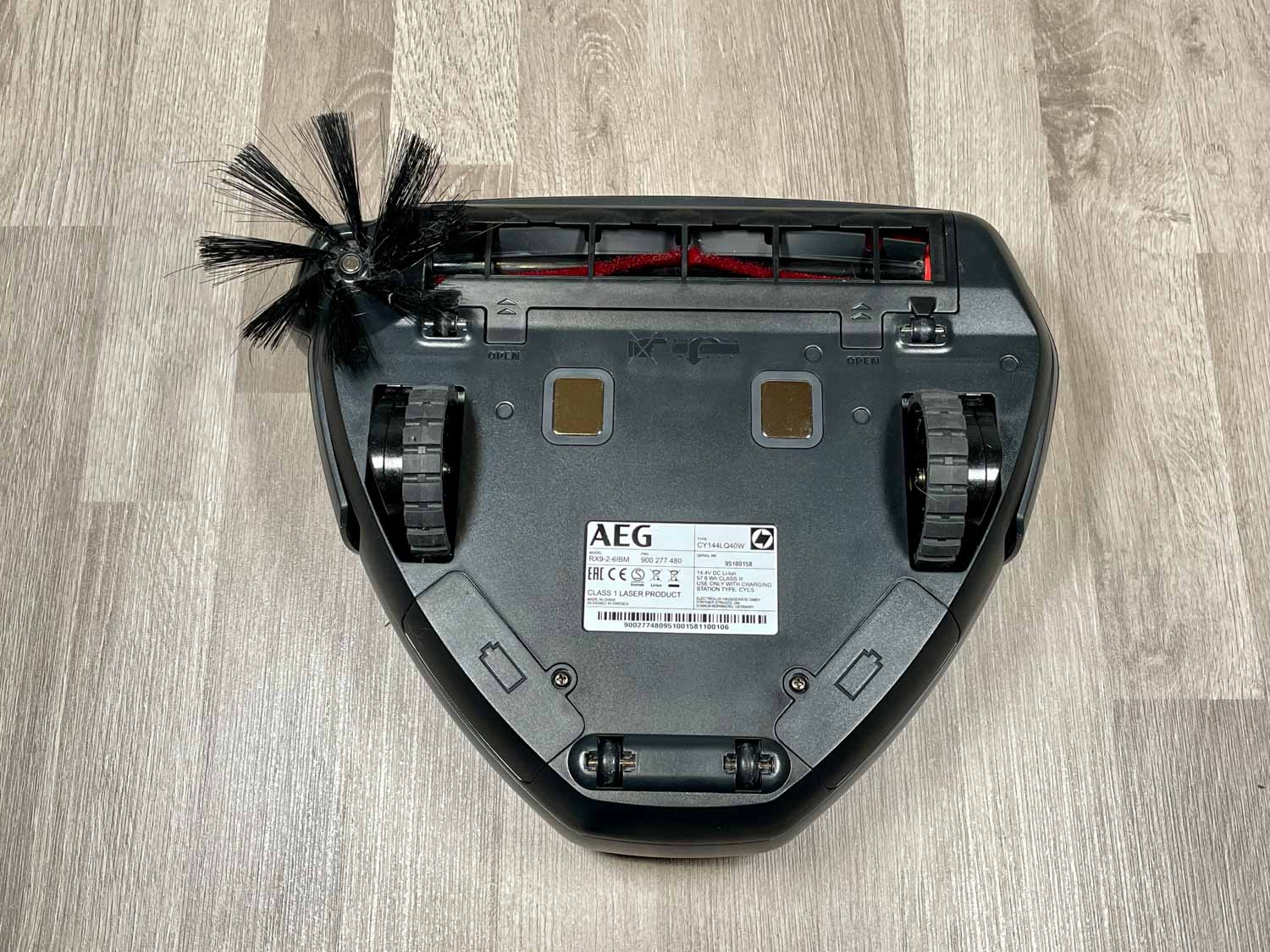 Die Unterseite ist auch recht interessant gestaltet. Eine sehr lange, aber seitlich sitzende Bodenbürste, die aus Gummilamellen und Borsten besteht, wurde an der Front des Roboters positioniert. Mittig erkennst du dagegen die Ladekontakte für die Ladestation. Zwei große Räder, begleitet mit vier kleinen, sind dann noch die einzigen Dinge, die du finden kannst. Absturzsensoren findest du nicht. Er erkennt Abgründe über die Kamera und fällt diese nicht herunter.