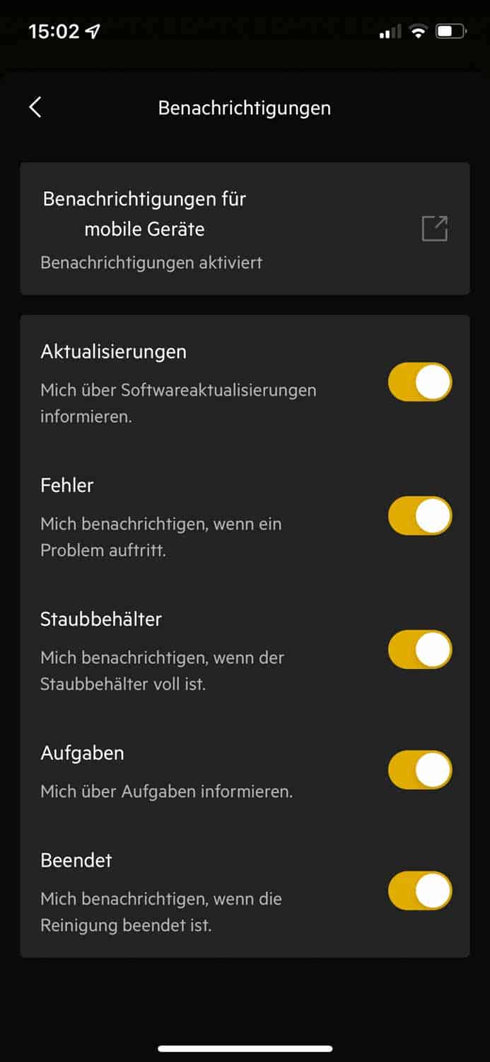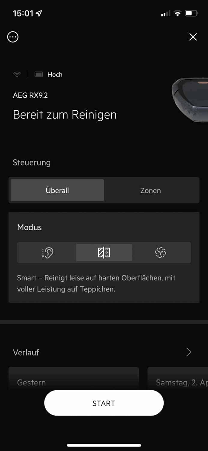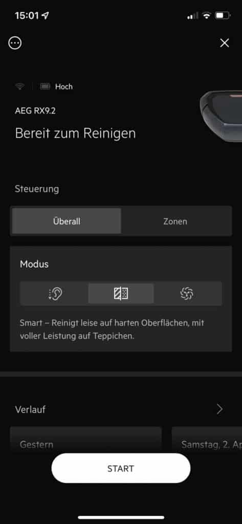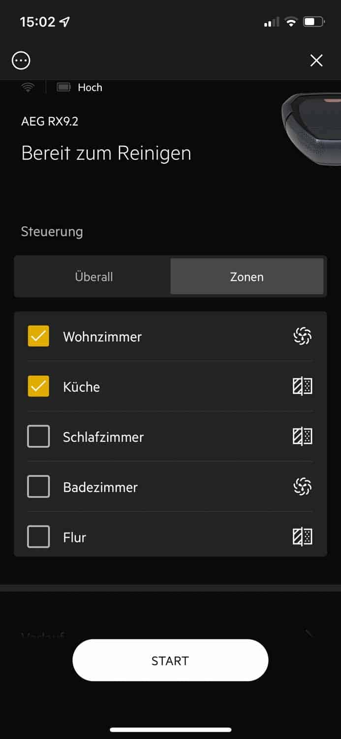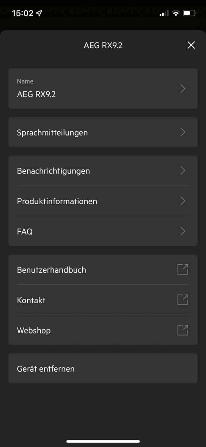 Am einfachsten ist abermals das Steuern des Roboters über die auf dem Roboter befindlichen Steuerelemente. Wenn du jedoch den kompletten Funktionsumfang des AEG RX9.2 genießen möchtest, musst du ihn in dein heimisches WLAN einbinden. Nur so kommt man an erstellte Karten, Saugleistungsanpassungen und weiteres. Hier zeige ich dir eine Übersicht an Funktionen, die der Roboter mit verwendeter App leistet.