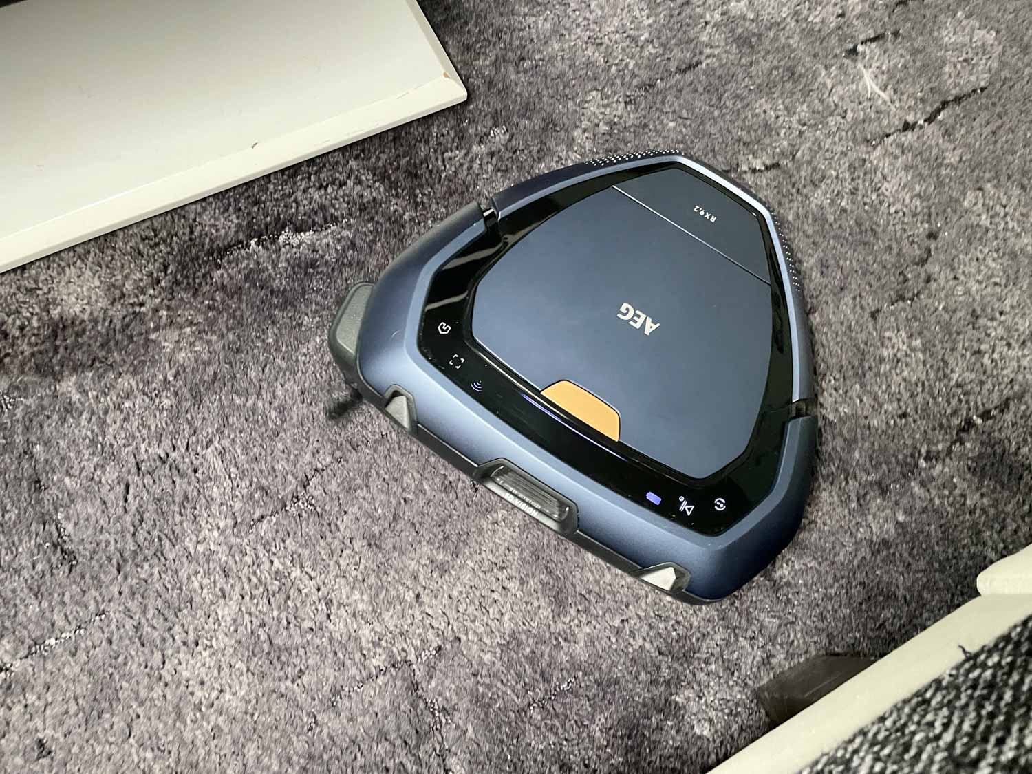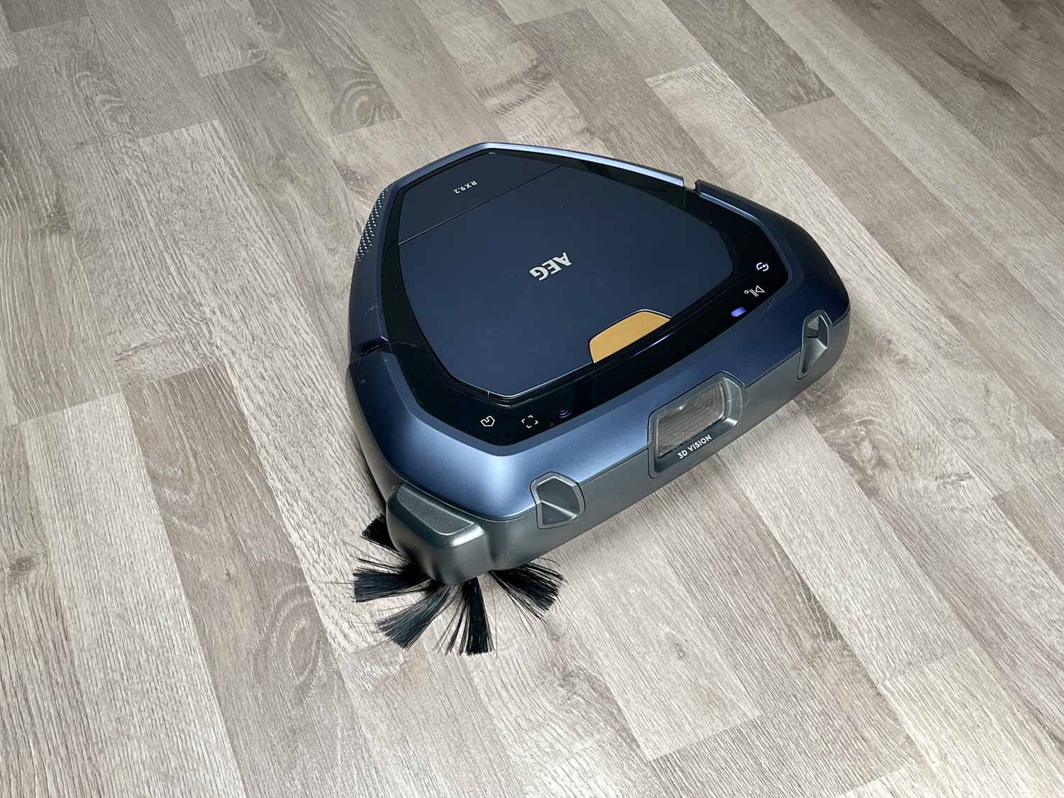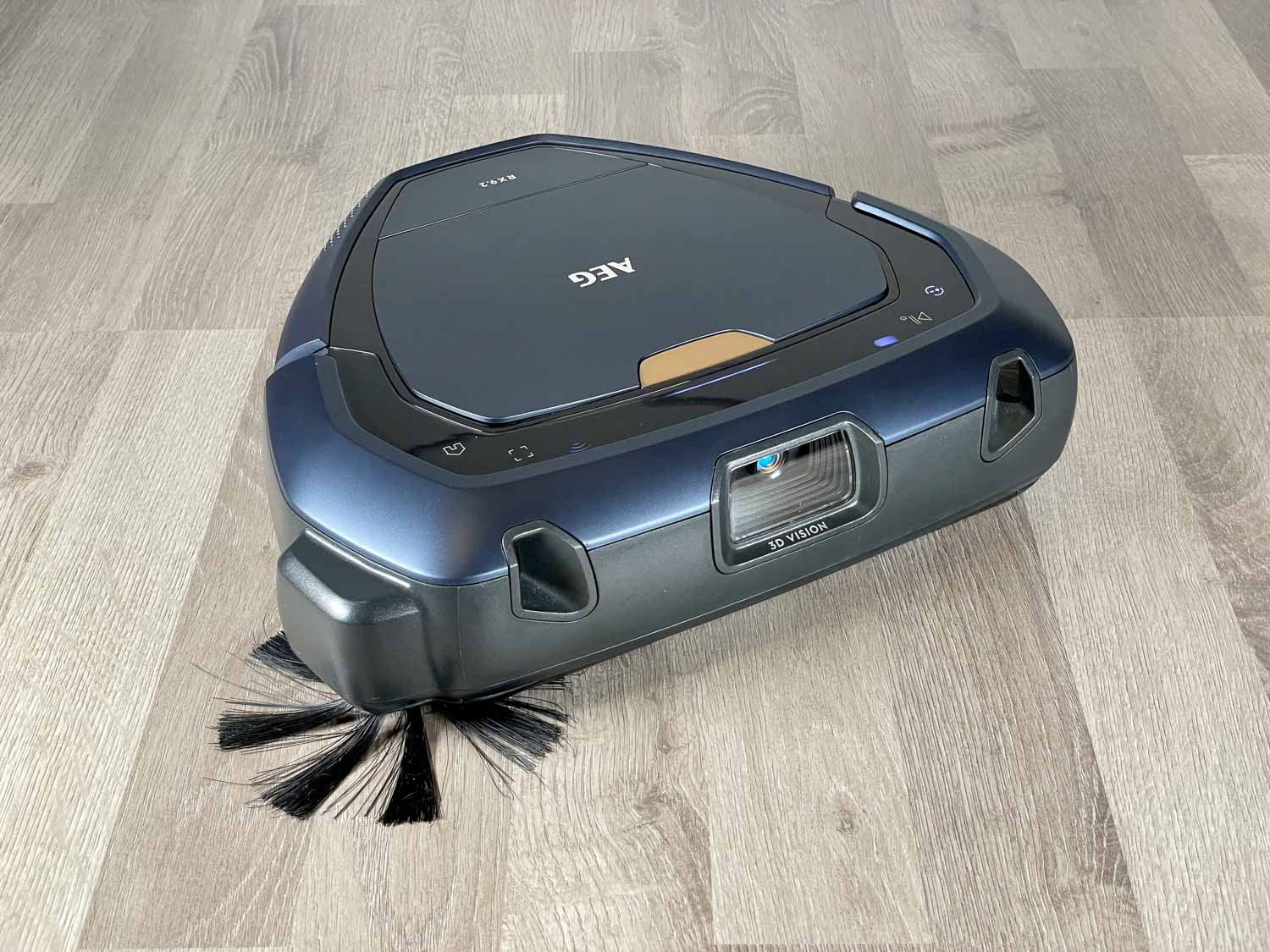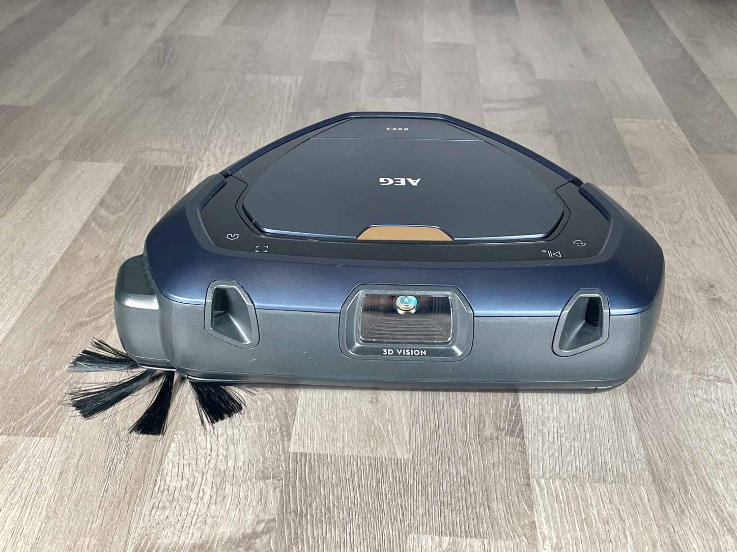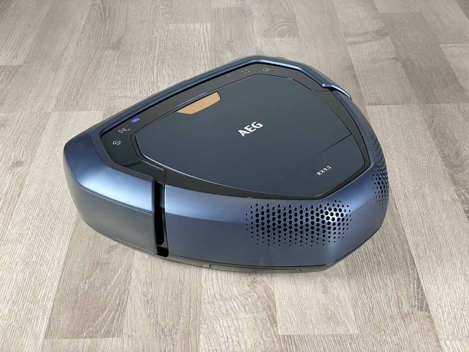 Zugegeben, die Form des AEG RX9.2 sieht sehr futuristisch aus. Seine dreieckige Form ist kaum mal gesehen, verspricht dafür einiges. Der Roboter kommt in einem matt-dunkelblauen Kunststoff daher, das mit hochglänzenden Zierelementen bestückt ist. Auf der Oberseite befindet sich der eingesetzte und recht groß dimensionierte Staubbehälter, der über einen goldenen Schalter zu öffnen ist. Des Weiteren findest du verschieden beleuchtete Touch-Steuerelemente, mit denen man den Roboter starten, stoppen und zur Ladestation zurückschicken kann. Ebenso gibt es einige Info-Anzeigen. Auf dem in der Front verbauten Bumper springt dir sofort die 3D-Vision Kamera entgegen, die mit zwei sich überkreuzende Laser begleitet werden. Auf den anderen Seiten befinden sich lediglich Lüftungsschlitze. Ein Lautsprecher gibt eine beliebige Sprache von sich. Seitlich gibt es noch eine einzige, recht weit herausstehende Seitenbürste.