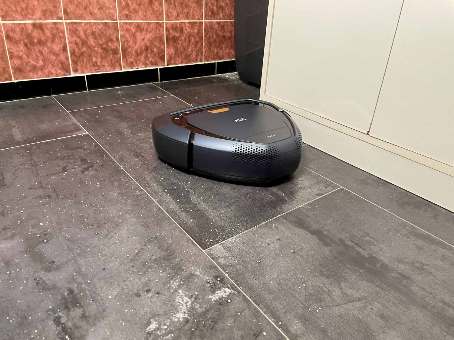 Hier zeigt der Hersteller mal wieder, was er auf dem Kasten hat. Die Saugleistung des AEG RX9.2 ist regelrecht enorm. Ob grober oder feiner Schmutz, da hat nichts eine Chance. Er saugt zuverlässig alles an anfallenden Schmutz restlos weg. Die Leistung gibt der Hersteller jedoch ungünstigerweise nicht in Pascal an, so kann ich nur sagen, dass sie überzeugend ist. Auch auf Teppichboden hat der Roboter eine gewaltige Leistung gezeigt. Er zieht sogar tiefen Schmutz aus den Fasern heraus. Er hat in Karims Testareal sogar für eine zeitweilige Bestleistung auf Teppich gesorgt. Das liegt vielleicht auch daran, dass der AEG RX9.2 seine Saugleistung auf Teppichboden automatisch auf ein Maximum erhöht. Das Funktioniert jedoch nicht immer zuverlässig. Bitte denk zudem daran, dass der Roboter mit 75 dB auf höchster Stufe sehr laut ist und das Geräusch der Bürste recht unangenehm.
