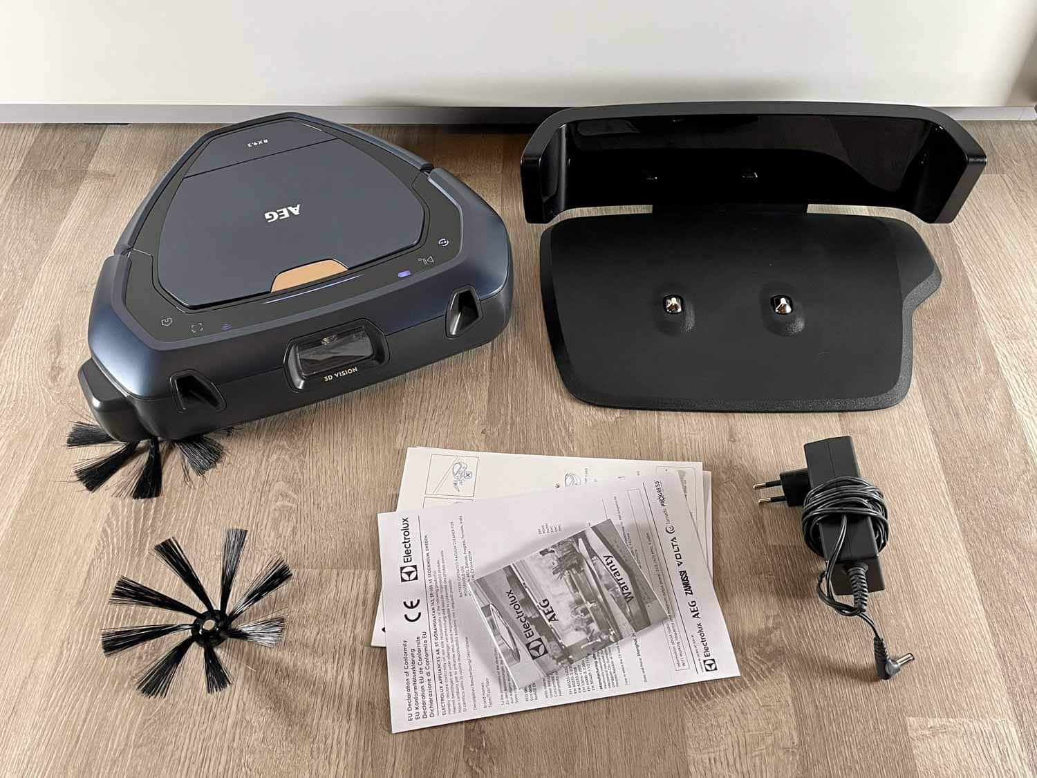 In einem bebilderten Karton kommt der AEG RX9.2 zu dir nach Hause. Den Lieferumfang habe ich mir persönlich etwas umfangreicher vorgestellt, da es kaum Ersatzteile dazu gibt. Lediglich eine zusätzliche Seitenbürste wird neben dem Roboter und dessen Ladestation mitgeliefert.