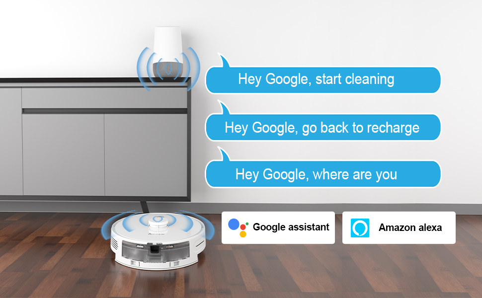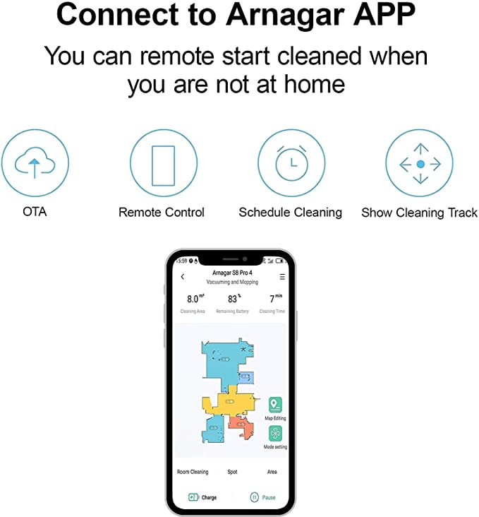 Damit auch alle Funktionen abrufbar sind, hat der Arnagar S8 Pro eine eigene App mit an Bord. Auf dieser wird die schon angesprochene erstellte Karte widergespiegelt. Diese wird in selektive Zimmer eingeteilt, die im Nachhinein händisch angepasst werden können. Sperrzonen und Nichtwischzonen sind kein Problem für den Roboter. Er soll ja nicht beim Wischen über den Teppichboden fahren. Jedes Zimmer ist einzeln ansteuerbar. Damit man nicht immer das Smartphone zücken muss, kann der Arnagar S8 Pro mit Amazons Alexa und Google Assistent interagieren. Man kann ihn starten oder stoppen damit.