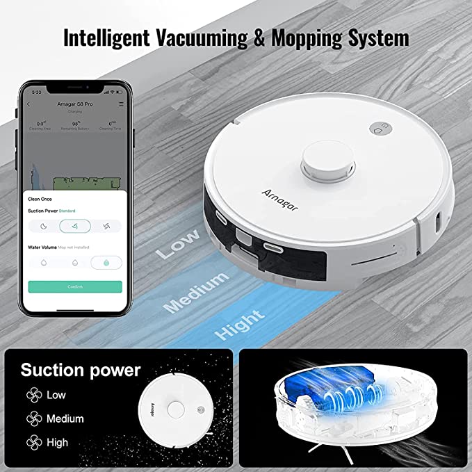 Dank durchschnittlich guten 4000 Pascal Saugleistung auf der höchsten Stufe und einer separaten Wischfunktion, soll der Saug-Wischroboter euer Zuhause täglich von Schmutz befreien. Sowohl die Saugstärke als auch der Wasserzufluss auf das Wischtuch sind in drei verschiedenen Stufen auswählbar. Somit kommt eine zufriedenstellende Reinigung auf jeglichen Hartböden und Teppichböden zustande. Der Roboter kann entweder saugen, wischen oder beides gleichzeitig. Im reinen Wischmodus kann er eine Y-förmige Bahnfahrt einrichten, die das Schrubben des Bodens imitiert. Ein Kombibehälter, der sowohl aus Staubbehälter als auch aus Wassertank besteht, sorgt für ein gleichzeitiges Entleeren und mit Wasser befüllen. Damit der Arnagar S8 Pro auch lang genug durchhält, hat der Hersteller ihm einen 5200 mAh starken Akku spendiert, der bis zu 250 Minuten durchhalten soll.