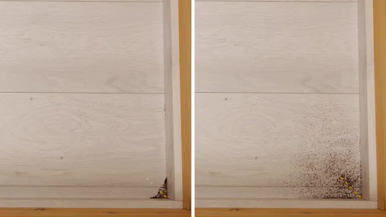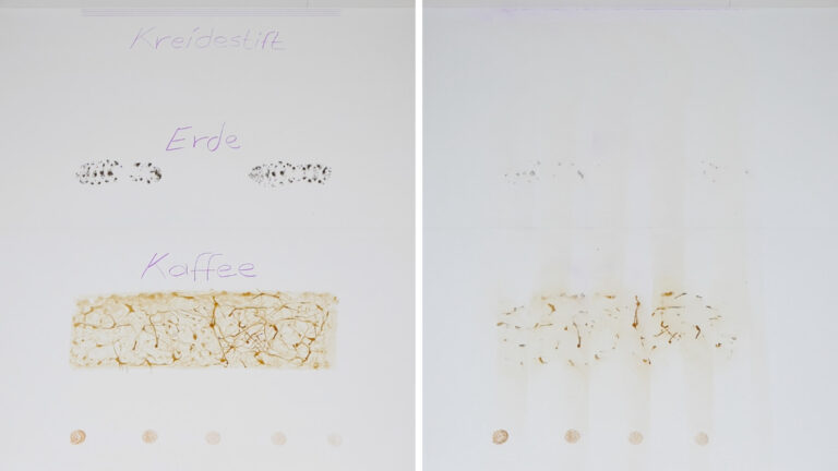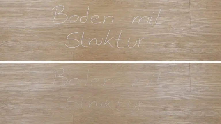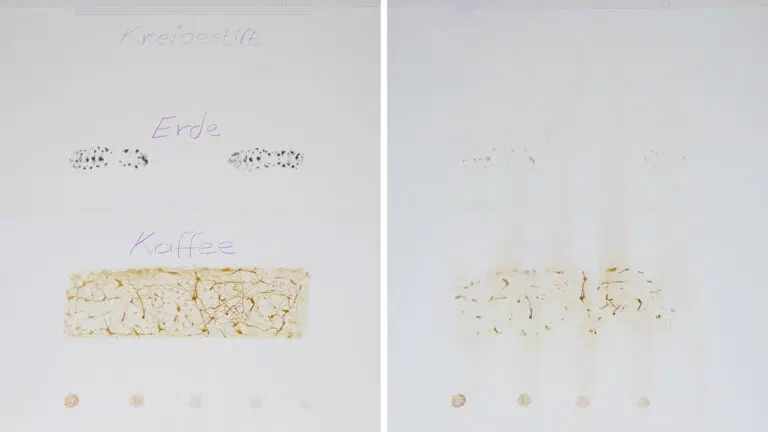 Während die Saugleistung größtenteils überzeugen kann, kümmert sich der Bosch Spotless Max Cam auch um die Nassreinigung des Haushalts. Um die Wischfunktion mit den rotierenden Mopps zu testen, verschmutzen wir den Boden mit Kaffee, Matsch und Ketchup und lassen die Flecken antrocknen. Zudem ist der Kreidestift am Rand und auf dem strukturierten Boden eine Herausforderung.