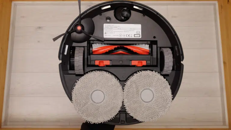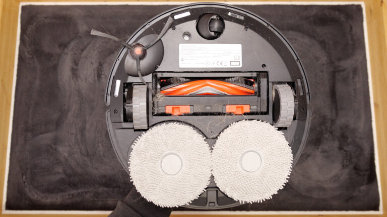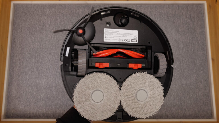 Auf der Unterseite sind dann die für die Reinigung wichtigen Komponenten zu finden. Mittig sitzt die Hauptbürste, darunter die beiden Wischmopps. Die kleine Seitenbürste ist ebenfalls zu sehen, genauso wie die Sensoren zur Absturzvermeidung und Teppicherkennung.