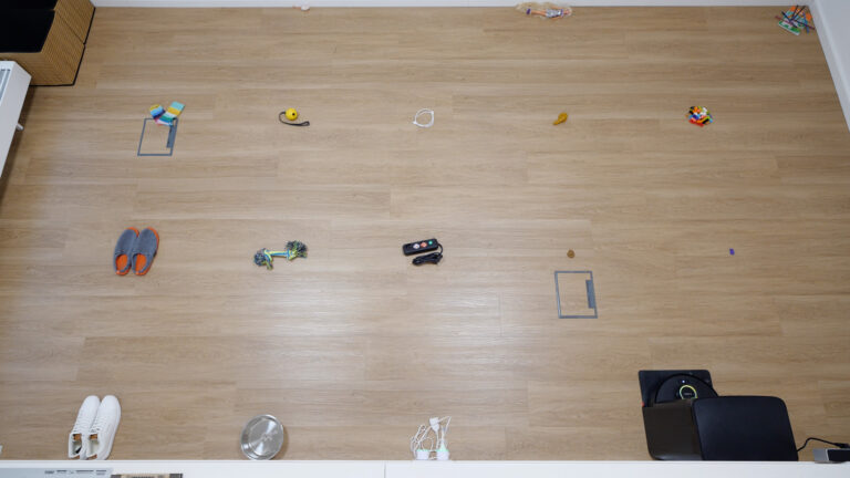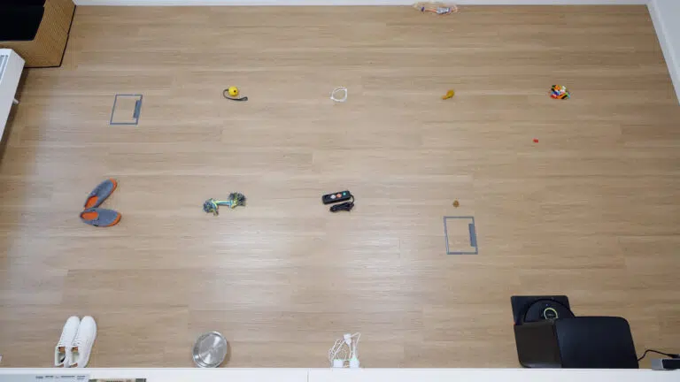 Die Obstacle Avoidance des Bosch Spotless Max Cam erkennt viele der ausgelegten Hindernisse richtig, hat mit den kleineren, schwieriger zu erkennenden Gegenständen allerdings ein paar Probleme. So fährt er gegen den Malblock, das Katzenspielzeug, die Socken, den einzelnen Legostein, und auch beim Legohaufen nimmt er ein Steinchen mit. Zudem touchiert er die beiden Kothaufen leicht, was im Ernstfall für eine kleine Schmiererei im Haushalt sorgen würde.