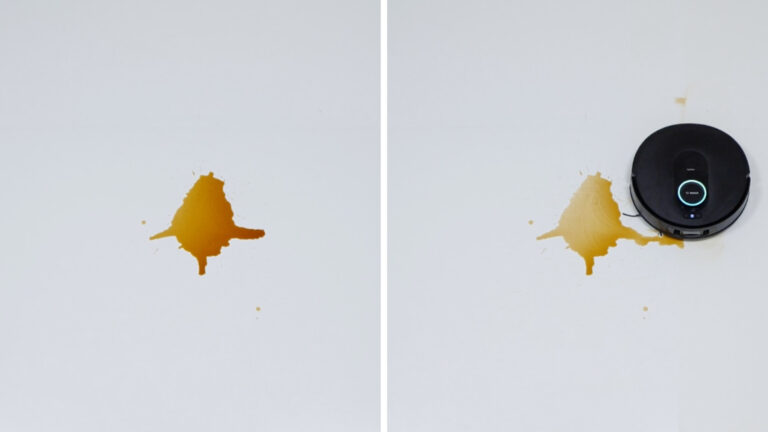 Neben den angetrockneten Verschmutzungen stellen wir den Bosch Spotless Max Cam auch mit einer Flüssigkeit auf die Probe. Im Optimalfall erkennt ein Roboter den verschütteten Kaffee, hebt seine Bürsten an und wischt den Fleck auf. Da der Bosch aber keine anhebbaren Bürsten hat, sollte er zumindest den Kaffee erkennen und umfahren, damit die Flüssigkeit nicht aufgesaugt wird. Das allerdings misslingt dem Saugroboter, sodass wir den Test abbrechen.