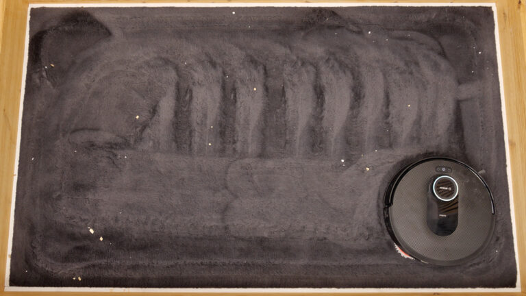 Auf dem Kurzflor-Teppich saugt der Roboter insgesamt 82,06 Prozent wieder auf – ein hervorragender Wert.