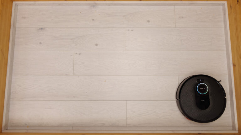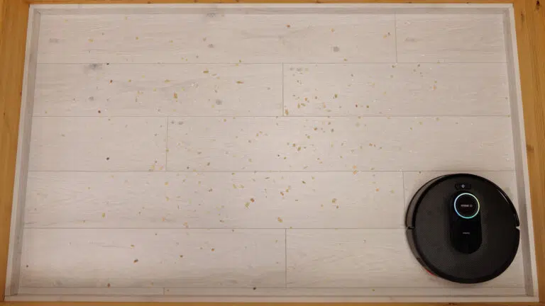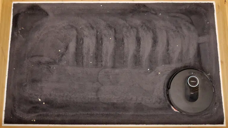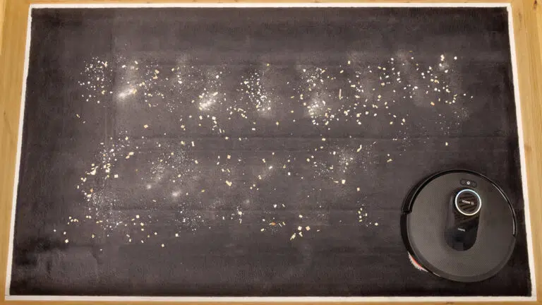 Der Spotless Max Cam hatte allerdings Probleme, die Testmenge in seinem Staubbehälter aufzunehmen, weshalb wir den Test anschließend mit halbierter Schmutzmenge wiederholt haben. Das Ergebnis wird dann verdoppelt, um eine Vergleichbarkeit mit anderen Saugrobotern herzustellen. Der kleine Staubbehälter wird aber mit Minuspunkten bestraft.