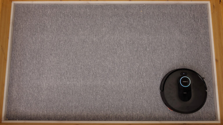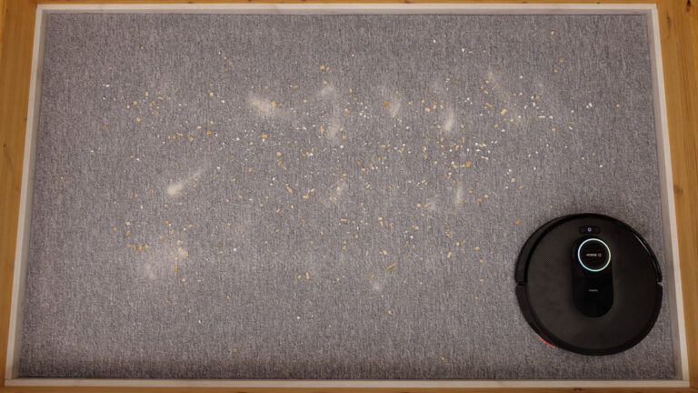 In Zeiten, in denen High-End-Saugroboter auf dem Datenblatt mit 30.000 bis 40.000 Pa Saugkraft werben, mag der Bosch Spotless Max Cam mit „nur“ 11.000 Pa relativ schwach erscheinen. Doch Zahlen bedeuten in unserem Test nichts, es kommt auf das Zusammenspiel von Saugschacht, Bürste und Luftstrom an. Mit 100 g Schmutz, bestehend aus Vogelsand, Katzenstreu und Holzspänen, überprüfen wir auf verschiedenen Untergründen, wie gut ein Saugroboter auch wirklich saugt.