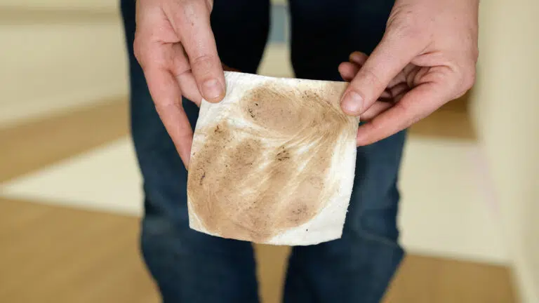 Wir wischen mit einem weißen, feuchten Tuch nach, um zu sehen, wie viel Schmutz der Roboter wirklich von der Fläche aufgenommen hat. Da der Spotless Max Cam ohnehin die Flecken nicht wirklich gut entfernen konnte, bleiben auch auf dem Tuch viele Rückstände zurück.