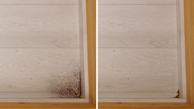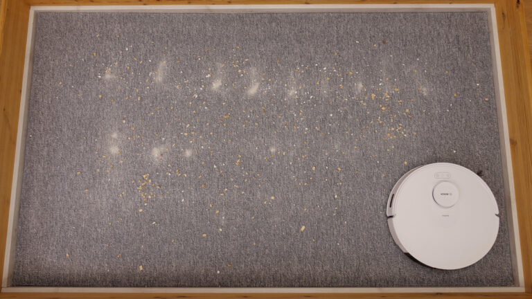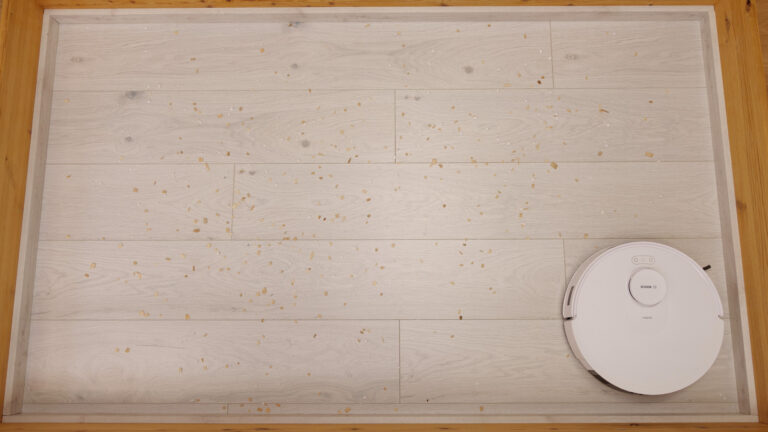 In der Navigation weiß der Bosch Sportless + also zu überzeugen, entscheidend wird es nun in unserem Reinigungstest. Fürs Saugen stehen dem Roboter bis zu 11.000 Pa Saugkraft zur Verfügung, was für viele Arbeiten ausreichen dürfte. Wie gut das Gerät wirklich saugt, testen wir wie gewohnt mit einem Mix aus Vogelsand, Katzenstreu und Holzspänen, den wir auf verschiedenen Untergründen verteilen. Der Saugroboter soll dann auf maximaler Stufe und mit eventuell vorhandener KI-Schmutzerkennung möglichst viel wieder aufnehmen.