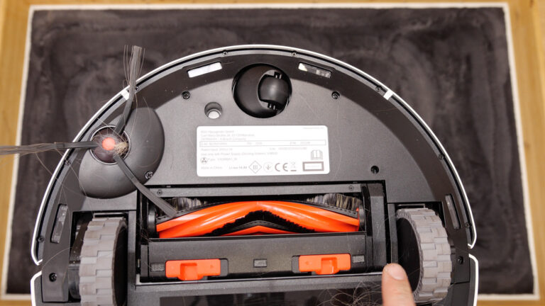 Entscheidend ist aber der Blick im Anschluss unter das Gerät. Hier zeigt sich, dass auf Laminat keine Haare in den Bürsten hängengeblieben sind. Auf dem Teppich allerdings haben sich ein paar Haare um die Bürste gewickelt. Das führt zu Punktabzügen.