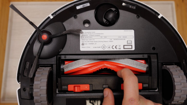 Die Hauptbürste besteht aus Kunststoff und ist mit harten und weichen Borsten versehen. Die sollen dafür sorgen, dass der Schmutz von verschiedenen Bodenarten gut aufgenommen wird. Gleichzeitig soll die Form der „Carbon Power Brush“ das Verwickeln von Haaren verhindern. Mit wenigen Handgriffen lässt sich die Bürste von der Unterseite entnehmen.