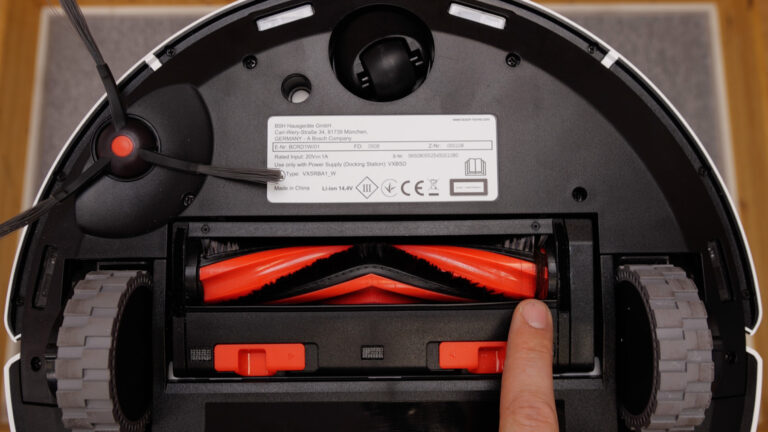 Normalerweise testen wir noch den Umgang mit Flüssigkeiten und natürlich auch die Selbstreinigungsfunktion. Da der Bosch Spotless + weder eine Hinderniserkennung (siehe oben) noch eine Reinigungsstation hat, verzichten wir auf diese Tests. Die Wischplatte muss also vom Nutzer selbst gewaschen werden – entweder per Hand oder in der Waschmaschine.