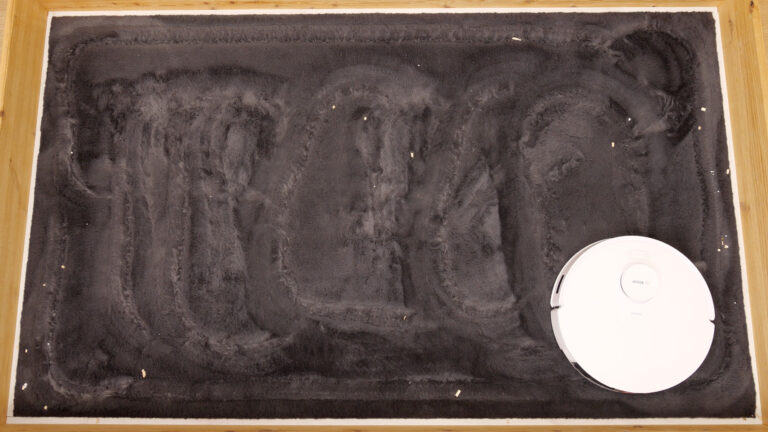 Der Bosch Spotless + bekommt in unserem Test klar die Grenzen aufgezeigt, was angesichts der starren Wischplatte allerdings auch kaum verwundert. Da er keinerlei mechanischen Druck auf den Boden bringt, zieht der Saugroboter einfach nur ein feuchtes Tuch hinter sich her. Dieses wird zwar kontinuierlich mit Wasser beträufelt, doch um Flecken zu entfernen, reicht das bei weitem nicht. Auch eine Zwischenmoppwäsche ist mangels Reinigungsstation nicht möglich. So hinterlässt das Gerät ein deutlich verschmutztes Testareal.