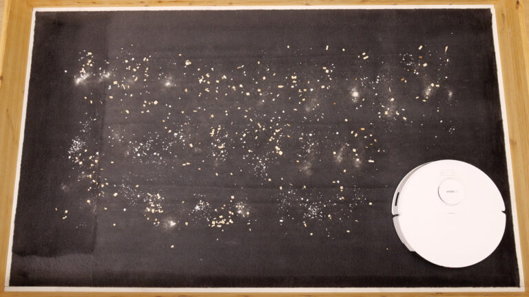 Der Spotless + besitzt zwar keine KI-Erkennung, fährt das Areal aber im Schachbrettmuster gründlich ab. Auf Laminat saugt er so insgesamt 98,46 g wieder auf. Ein sehr guter Wert.
