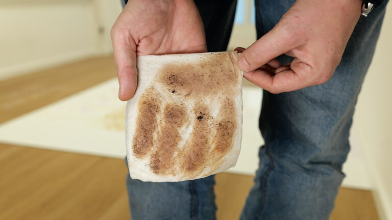 Im Nachgang wischen wir mit einem feuchten Tuch nach, um zu sehen, wie gut der Schmutz wirklich von der Fläche aufgenommen wurde. Da der Spotless + allerdings kaum Dreck entfernt hat, bleibt noch viel von der Verschmutzung auf dem Tuch zurück. Ein erwartbares wie schmutziges Ergebnis.