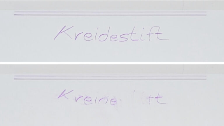 Auch am Rand fällt die Wischleistung durch. Da die Platte nicht zur Seite ausfahren kann, blieben die vier aufgemalten Striche quasi unberührt. Insgesamt ist die Wischfunktion nicht dafür da, um hartnäckige Verschmutzungen wirklich zu entfernen. Allenfalls zum feuchten Staubwischen ist die Platte geeignet.