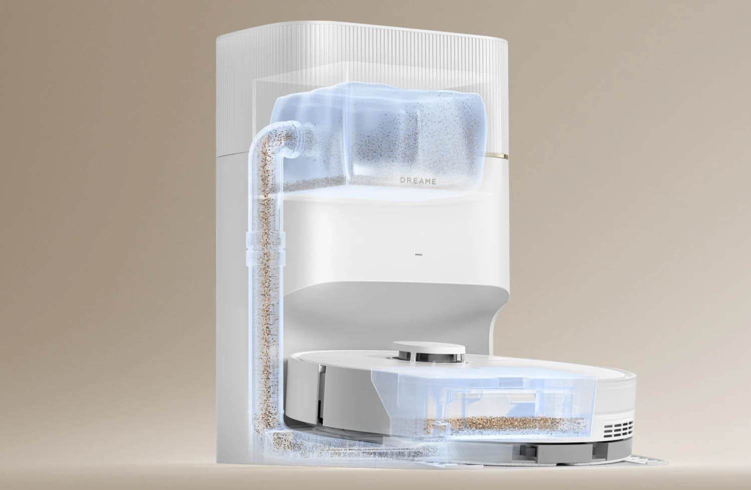 Besonders praktisch beim Dreame D20 Pro Plus ist die kompakte Absaugstation. Sie ist sehr schlank und hat trotzdem Platz für einen 5-Liter-Staubbeutel, der bis zu 150 Tage ohne Entleerung ausreichen soll. Das ist ein wirklich praktisches Feature, welches den eigenen Aufwand stark reduziert.