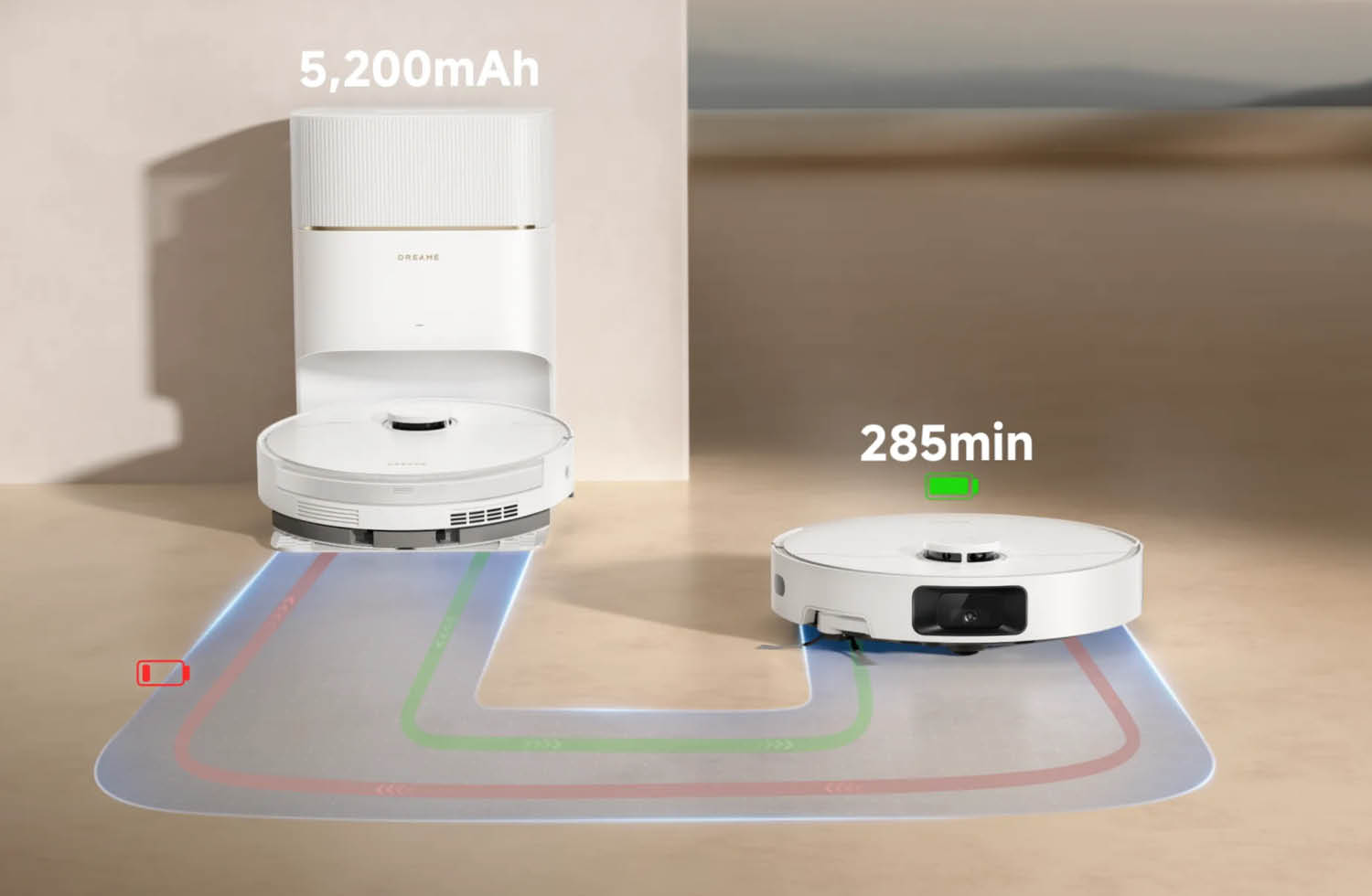 Dank des 5200-mAh-Akkus hat der Dreame D20 Pro Plus laut Hersteller eine Laufzeit von bis zu 285 Minuten. Bei geringer Akkuladung fährt der Saugroboter zum Aufladen automatisch zur Station und setzt die Reinigung danach fort. Jedoch ist das eine lange Akkulaufzeit, mit der man keine Probleme haben sollte.