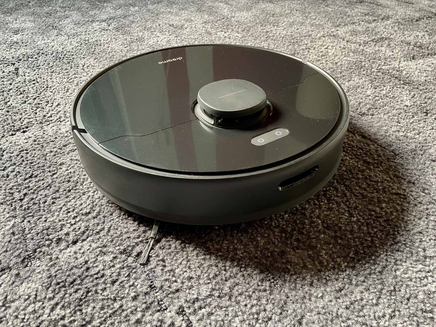 Klavierlack-Schwarzes und bekanntes Design neu aufgesetzt. Das beschreibt genauestens das Erscheinungsbild des Dreame D9. Brillante Qualität zu einem günstigen Preis. Auf der Oberseite findet man das jetzt komplett in schwarz gehaltene LiDAR-System, das in Form eines Laserturms auf den Roboter montiert wurde. Dieser erlaubt es dem Dreame, sich intelligent zu verhalten. Außerdem ist er mit einem Bumper vor Hindernissen geschützt. Vor dem Turm findet man jetzt nur noch zwei gummierte Knöpfe, mit denen man den Roboter manuell starten, stoppen oder zur Ladestation zurückschicken kann. Der Knopf für eine Spotreinigung gibt es nicht mehr. Auf den Produktnamen in Form eines Druckes auf dem Roboter wurde, im Gegensatz zum Dreame D9, verzichtet, dafür glänzt dieses Mal das Firmenlogo wieder etwas weiter hinten in Gold.