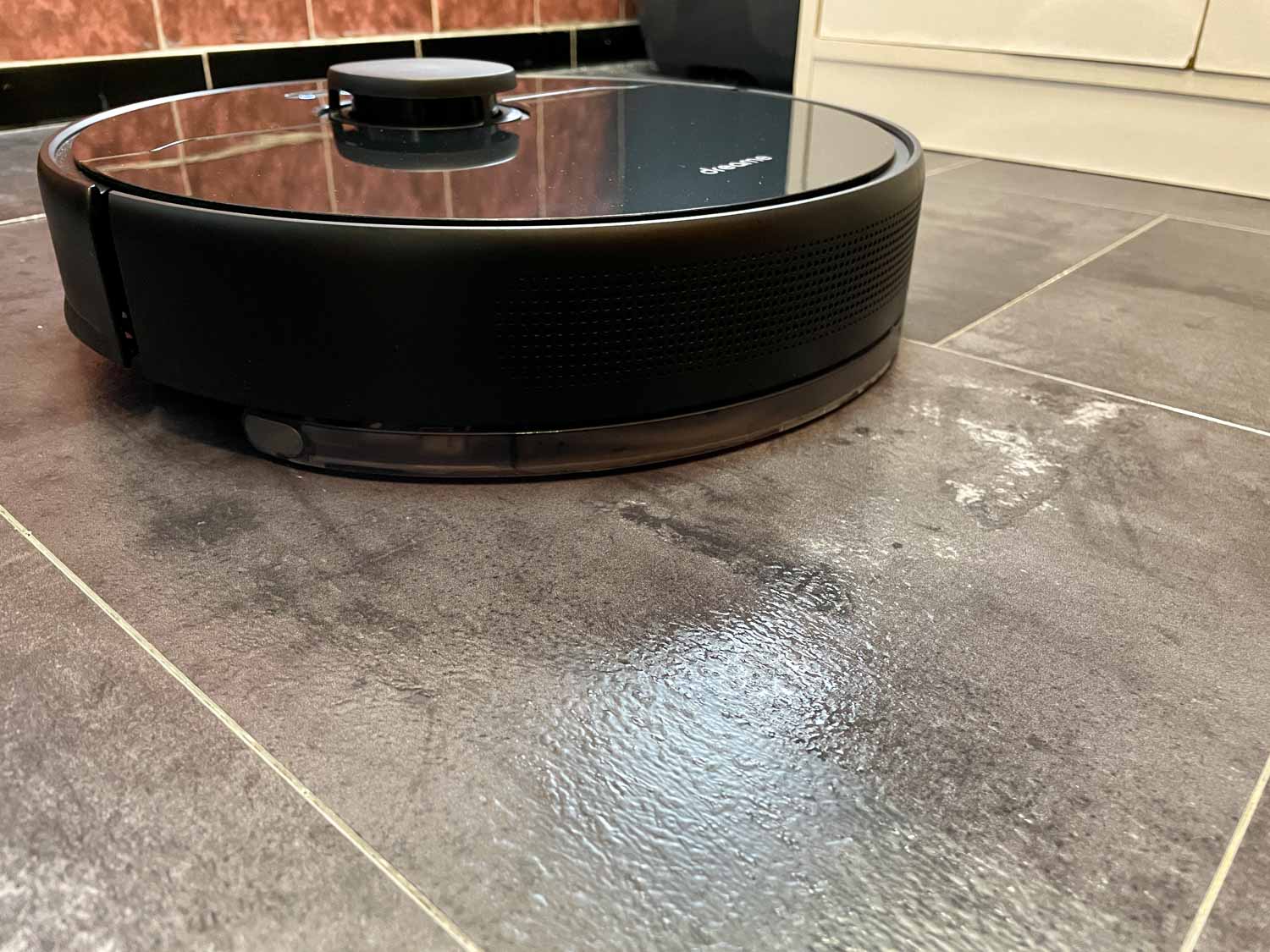 Das Hinterherziehen eines feuchten Lappens war vor geraumer Zeit noch die gängigste Art an Wischfunktion, die es bei Saug-Wischroboter gab. Inzwischen dominieren, vibrierende, oszillierende oder rotierende Wischfunktionen den Markt. Mehrheitlich aber nur bei den Premium Modellen der Hersteller gesehen. Der Dreame D9 Max hat hier noch die Standardmethode spendiert bekommen. Das Wasser kann durch die Appsteuerung in drei Stärken auf das Wasser abgegeben werden, was die Wischleistung für alle Hartbodentypen eignet. Das Wasser wird über die ganze Breite des Wischtuchs verteilt, was hässliche Radspuren verhindert. Der Wassertank sollte nach jeder Reinigung entnommen werden, da er sonst auf nacktem Boden geparkt wird. Eine Unterlegplatte wurde nämlich nicht mitgeliefert. Der Roboter erkennt natürlich selbstständig, ob er sich im Wischmodus befindet oder nicht, wenn der Tank angebracht wird. Im Test zeigte sich bei der Wischleistung des Dreame D9 Max ein gleichmäßiges Wischbild.